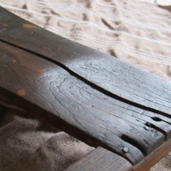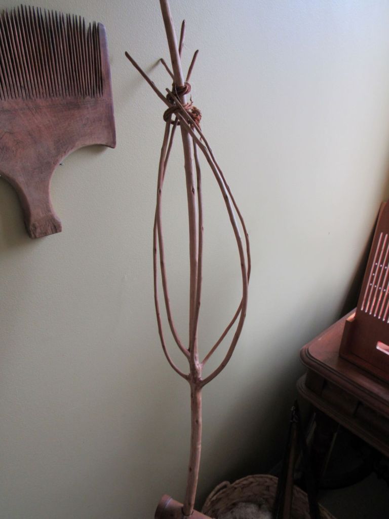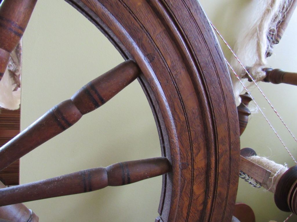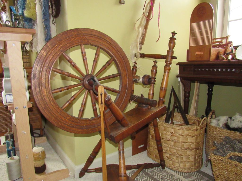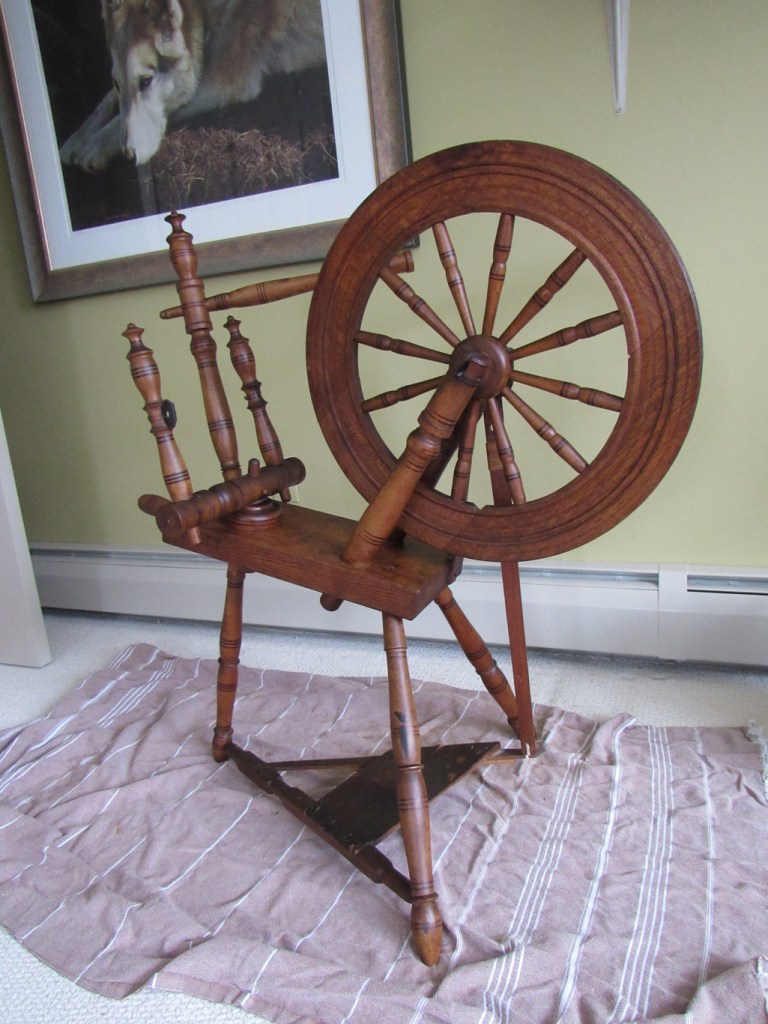 This wheel started it all for me. When I was growing up, it decorated the corner of our Connecticut living room, with a messy, dusty hank of flax drooping from the distaff. Somehow, when I was sixteen, I got it spinning again (with wool). After I moved to Alaska when I was twenty, the wheel became decoration in my brother’s house. Through the years, a flyer arm, the footman, and the treadle broke. I brought it to Maine when I retired, had it repaired, and it has been spinning my homegrown flax ever since. It’s solid as a rock–a lovely smooth spinner–even though it likely was made in the late 1700s and saw a lot of use.