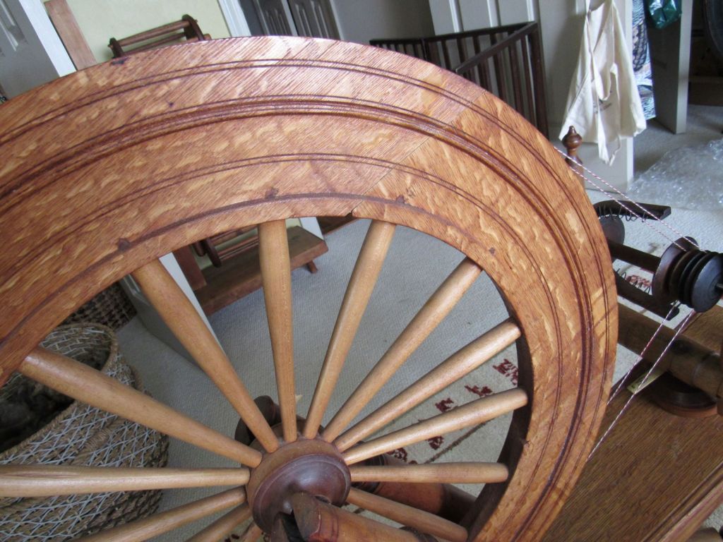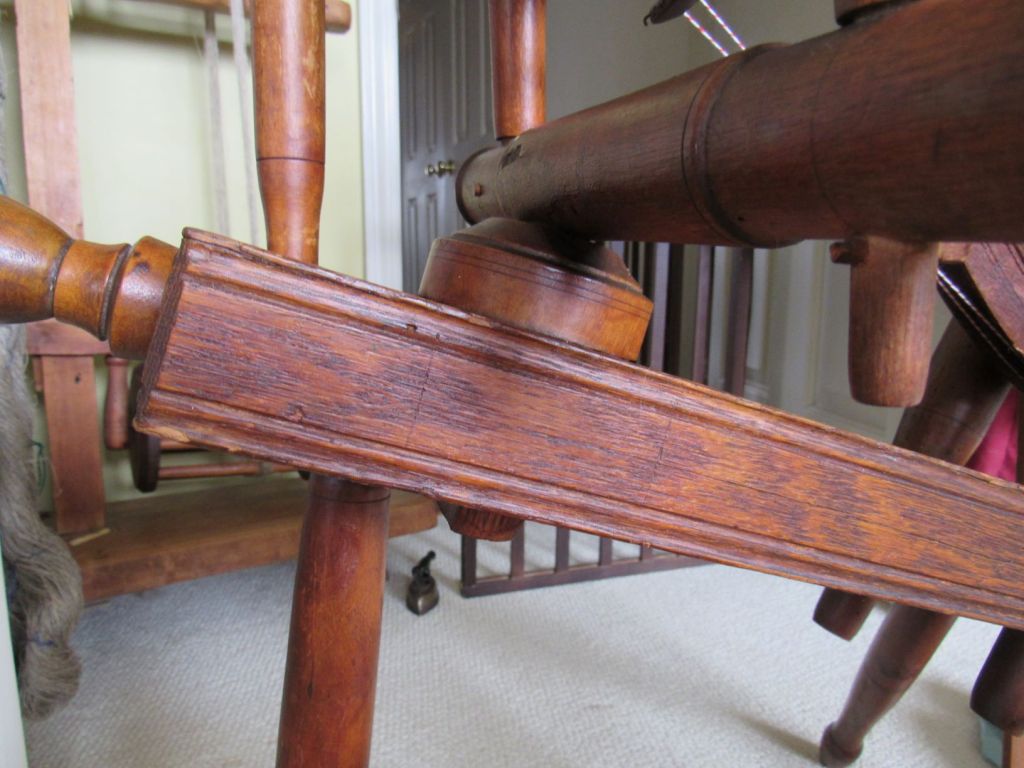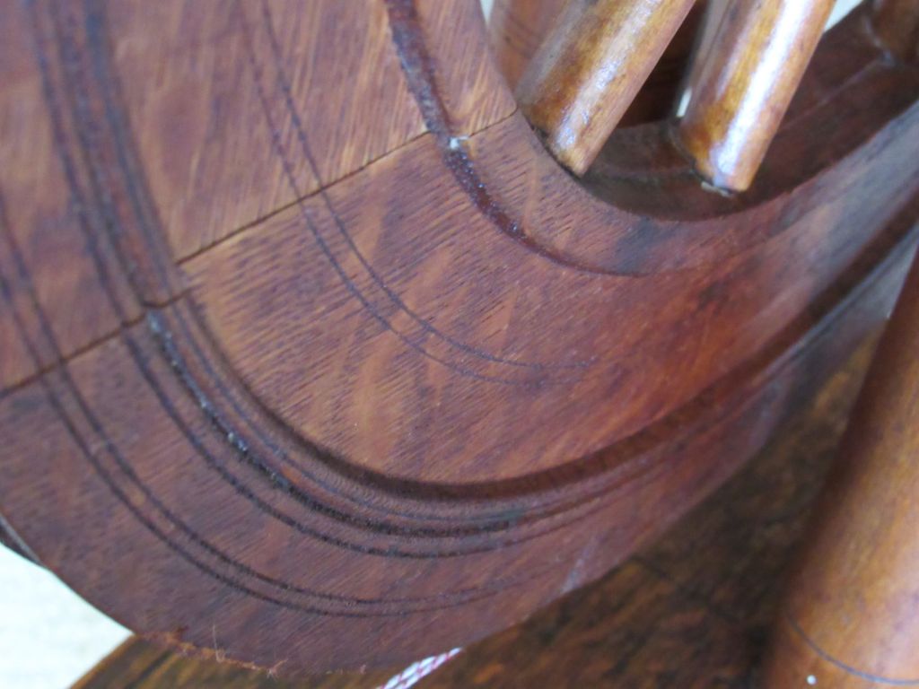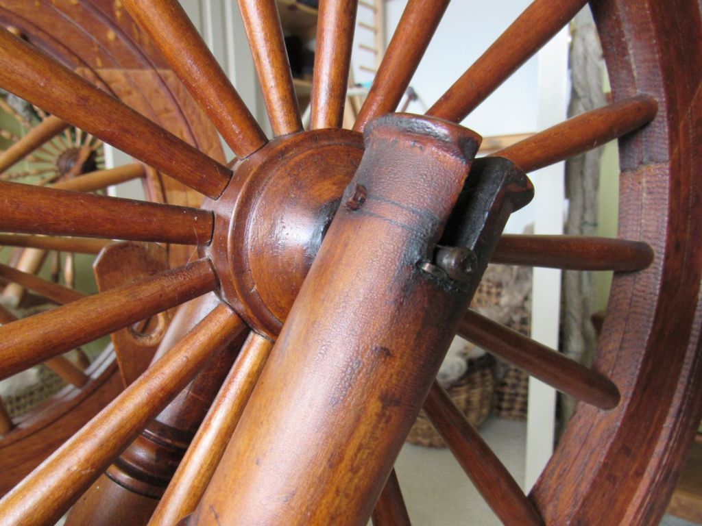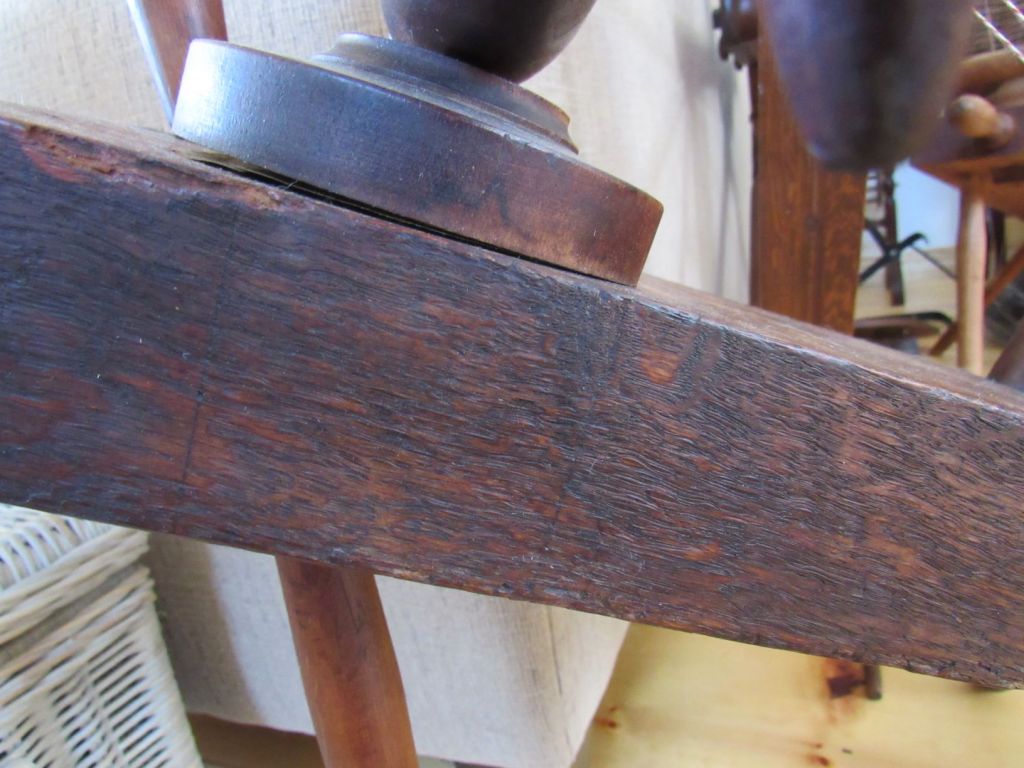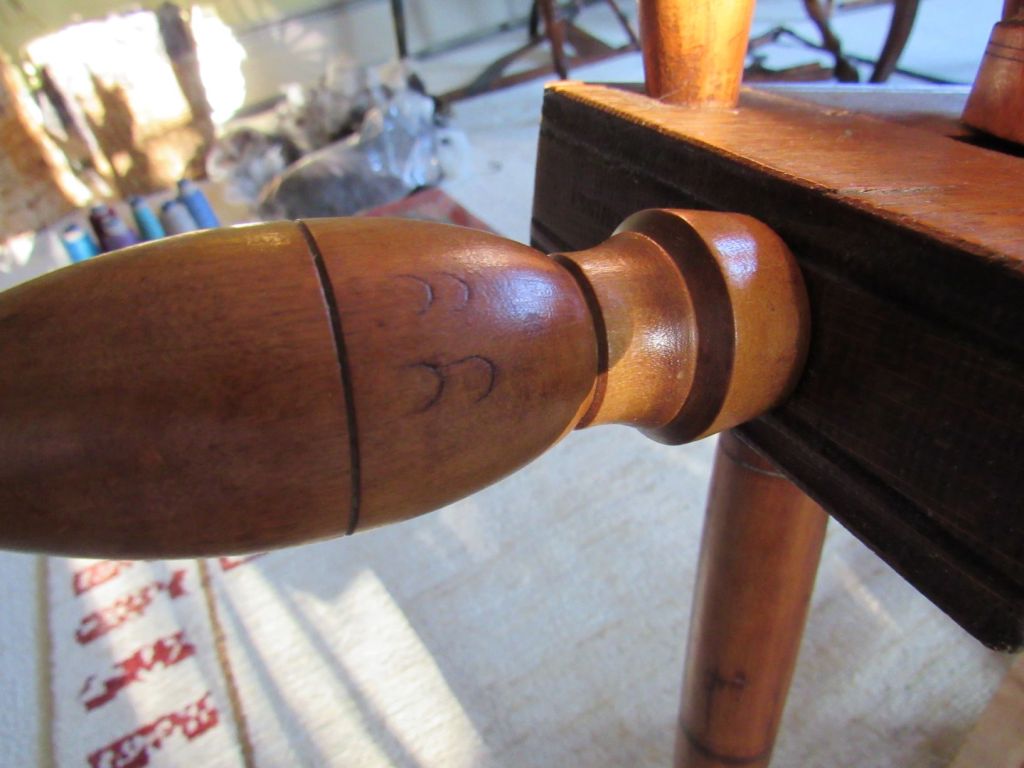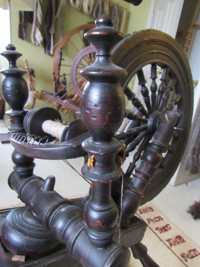 The wood is very blond, which is highly unusual for spinning wheels of the time. It’s just gorgeous and had clearly never seen the inside of a barn or attic, but had been lovingly cared for since the early 1800s. I’d love to know its history. Could it have been similar to the wedding wheels that we see from Europe—a status symbol wheel for a wealthy young bride who never actually had to use it?