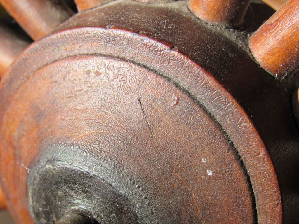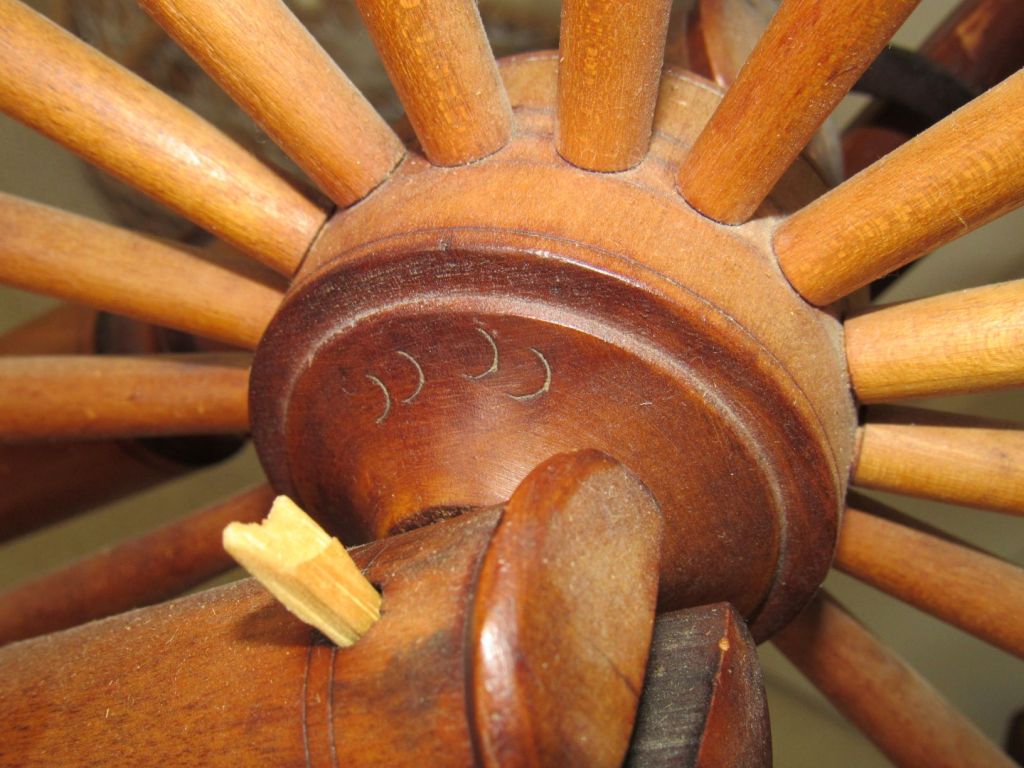 One interesting aspect of Cheney’s wheels is that parts are marked—treadle, table, tension knob, collar, hub, and flyer assembly—on my wheels with an “I” and a “CCCC.”