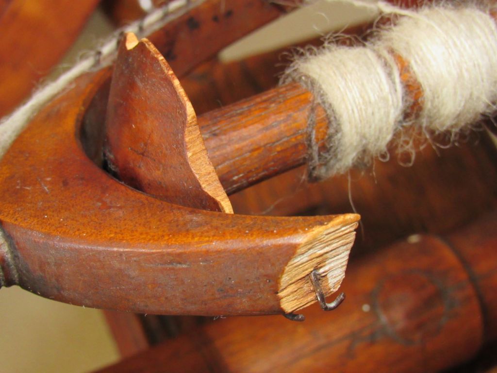 Although one flyer arm was broken and the whorl and bobbin had been chewed by a dog, I was thrilled to see that the flyer was marked with a “I,” just like the other marked parts, so it appears to be original.