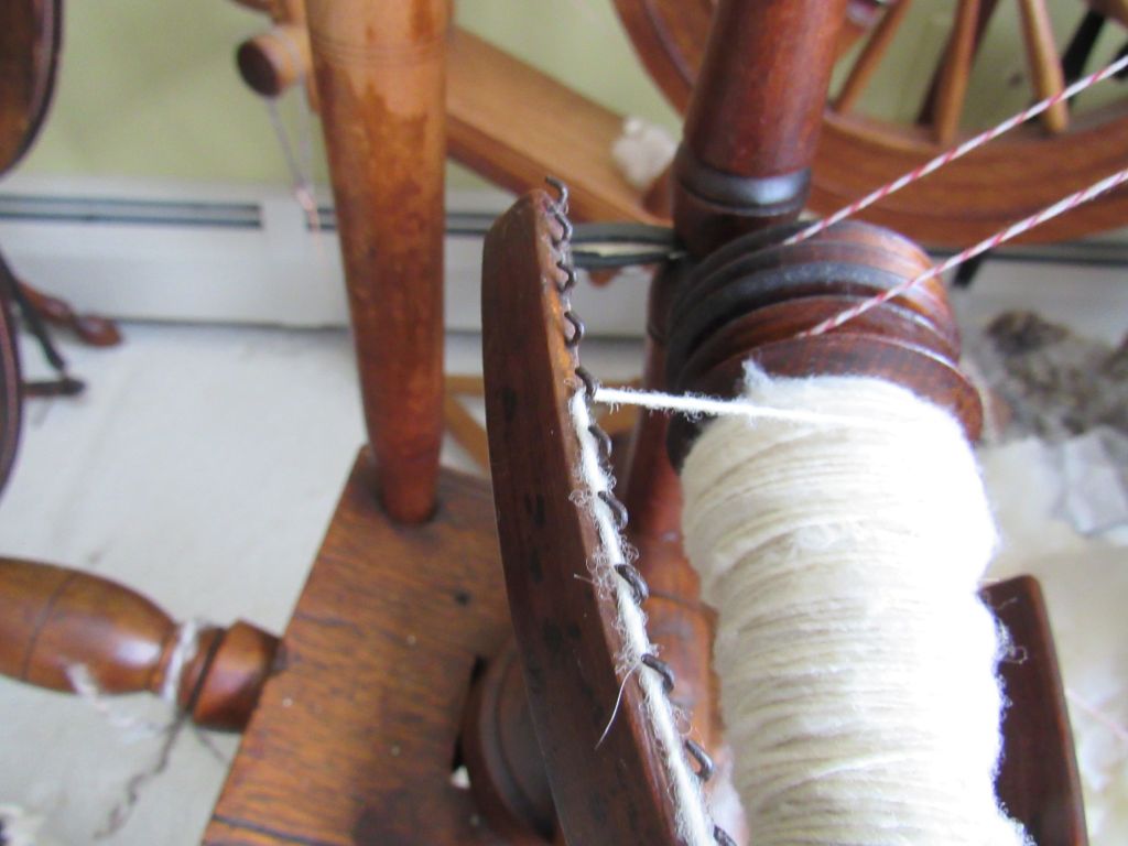 I had a flyer assembly made and Cicely started right up. Because the new mandrel has a larger orifice than most antique wheels, this wheel is my go-to for plying. The second wheel, Chancey, I bought recently from a woman in southern New Hampshire.