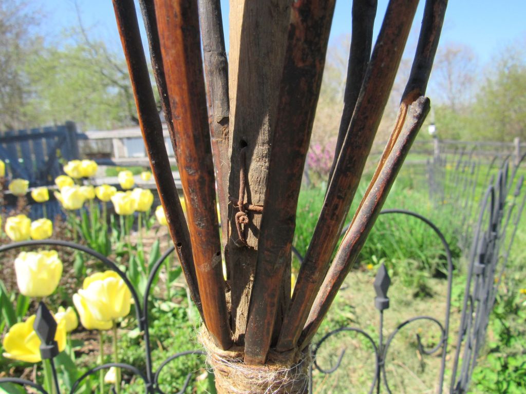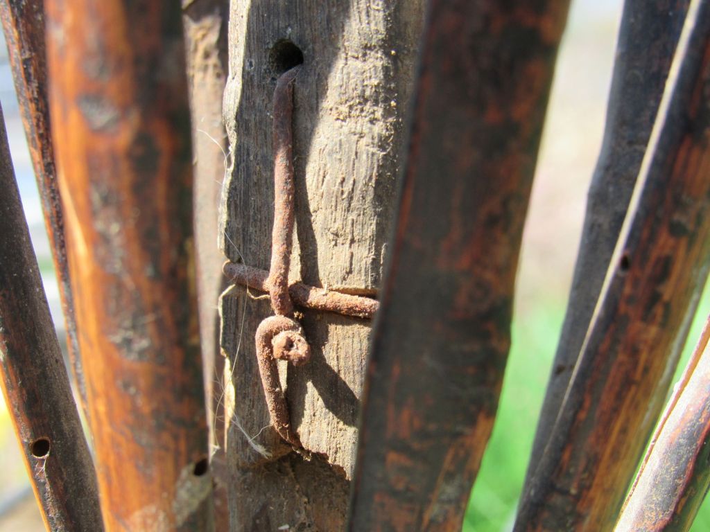 The arms of the cage at the top of the distaff are made from some light weight, pliable wood—almost like basket splints—and have small fish-hook-like prongs on the top.