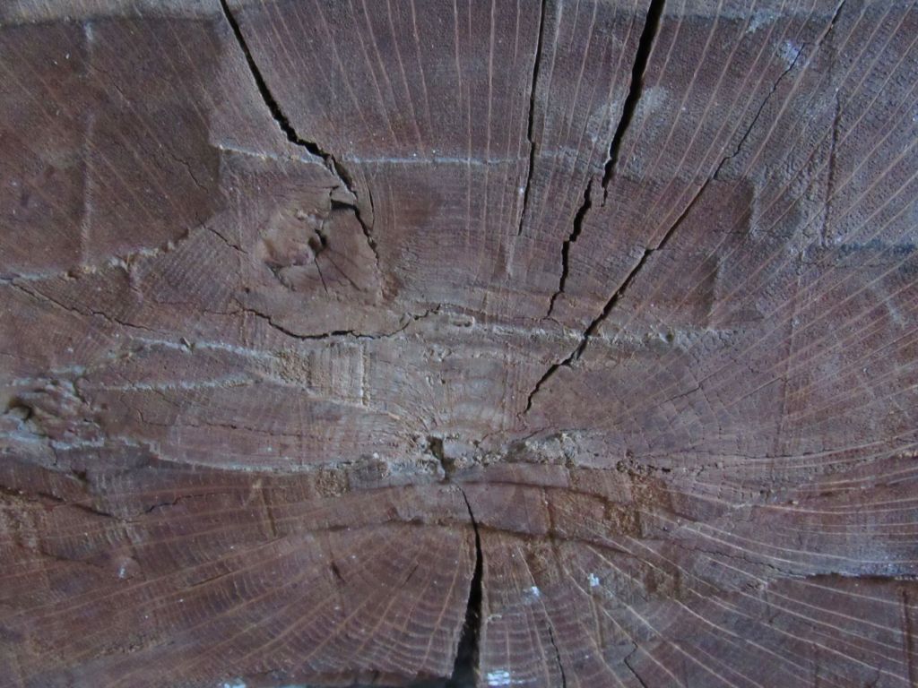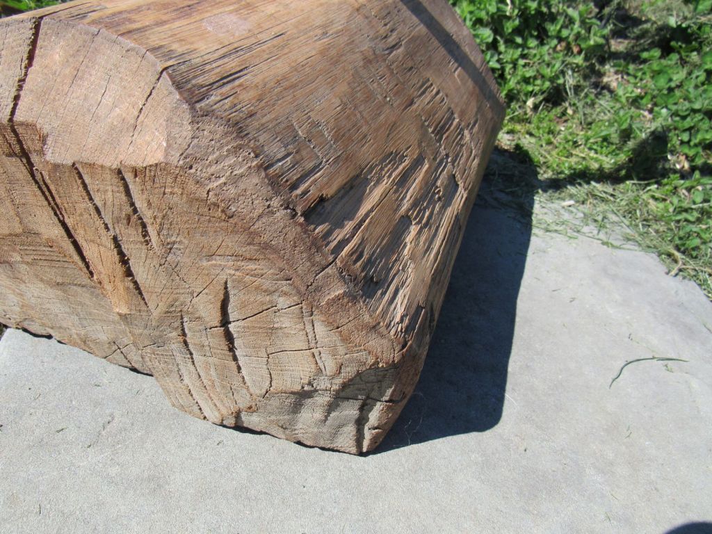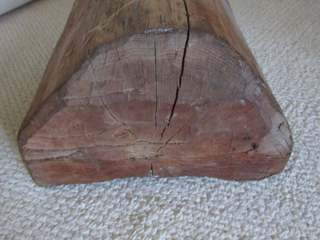 The base is a chunk of wood—it appears to have been shaped with an ax—with a hole for the distaff pole.