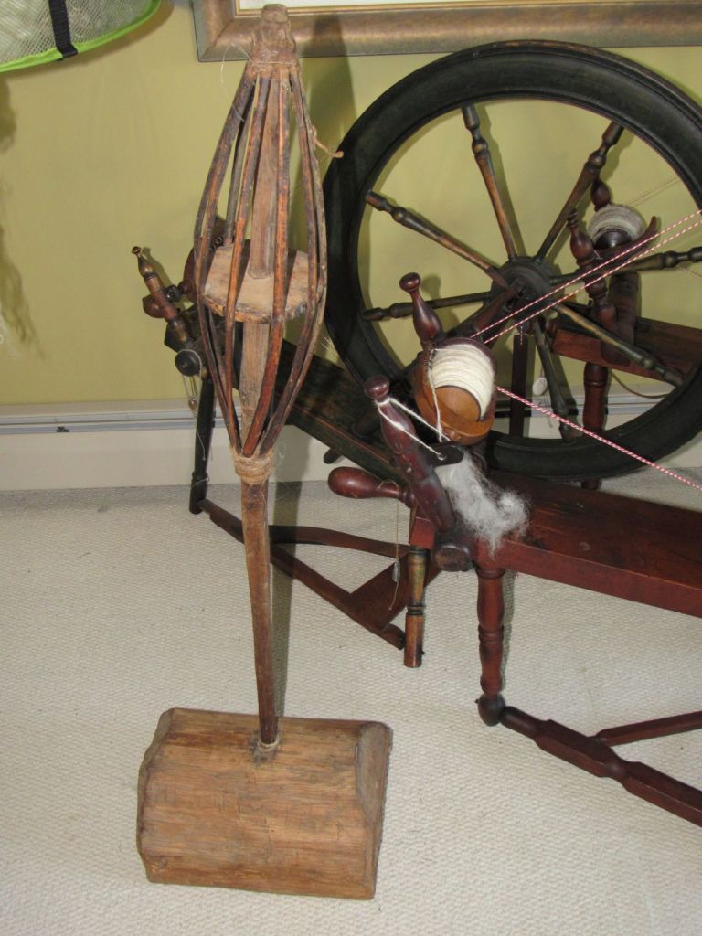 This standing distaff is a bit of mystery. Free standing distaffs were commonly used in many regions of Europe, but North American versions don’t appear very often. Those from Europe tend to be tall and ornate, accompanying beautifully turned wheels. They were used for spinning long flax and sometimes hemp fibers. Most flax wheels in North America had built-in distaffs, but there must have been spinners who preferred to use standing distaffs, so it’s surprising that we don’t see more of them.
