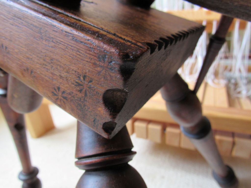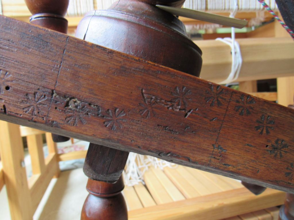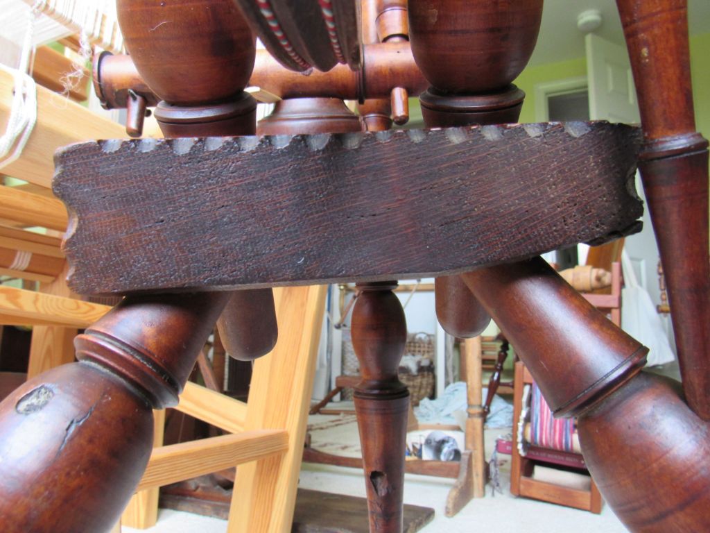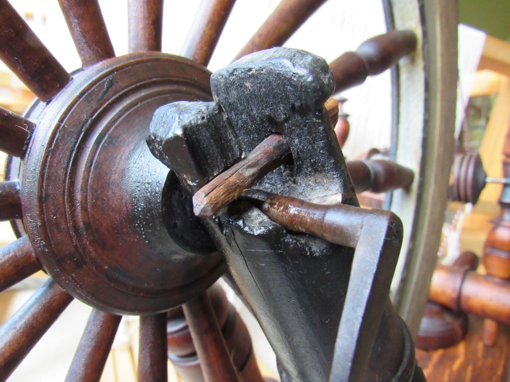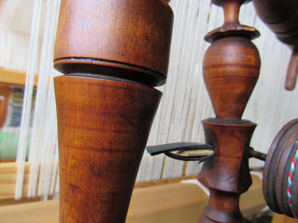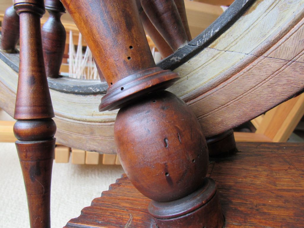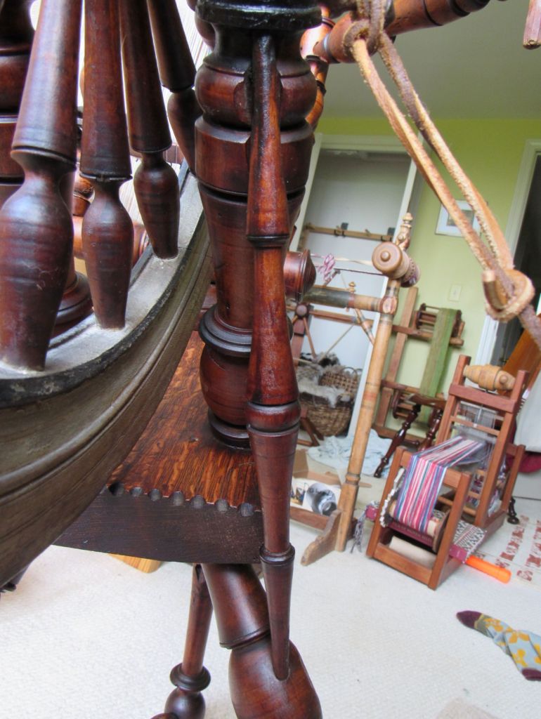 Once I started spinning, I understood that wear. Because the table is so short on this wheel, the spinner’s treadling leg rests naturally on the wheel’s front leg. It’s a comfortable accommodation. But, imagine how much fiber was spun on this wheel and how many decades of women’s legs rested on this wheel’s leg to smooth those grooves into oblivion. It’s a rare privilege to add my leg to their imprint.