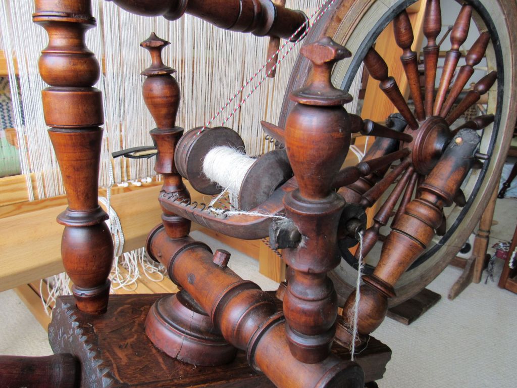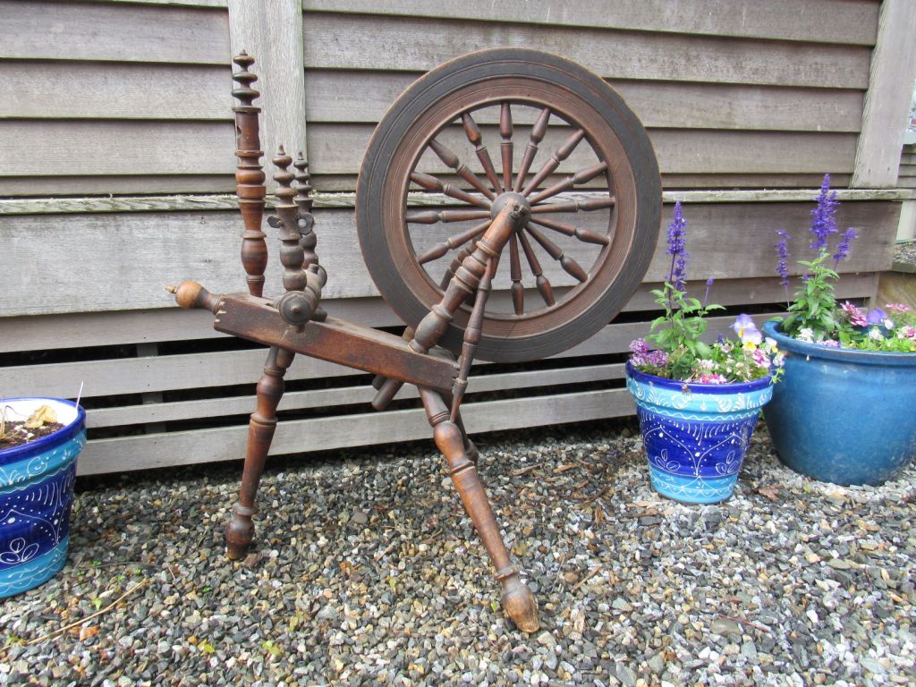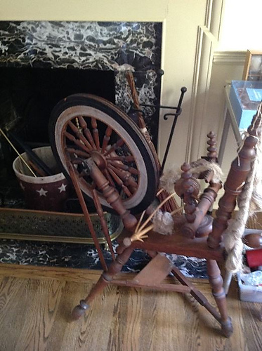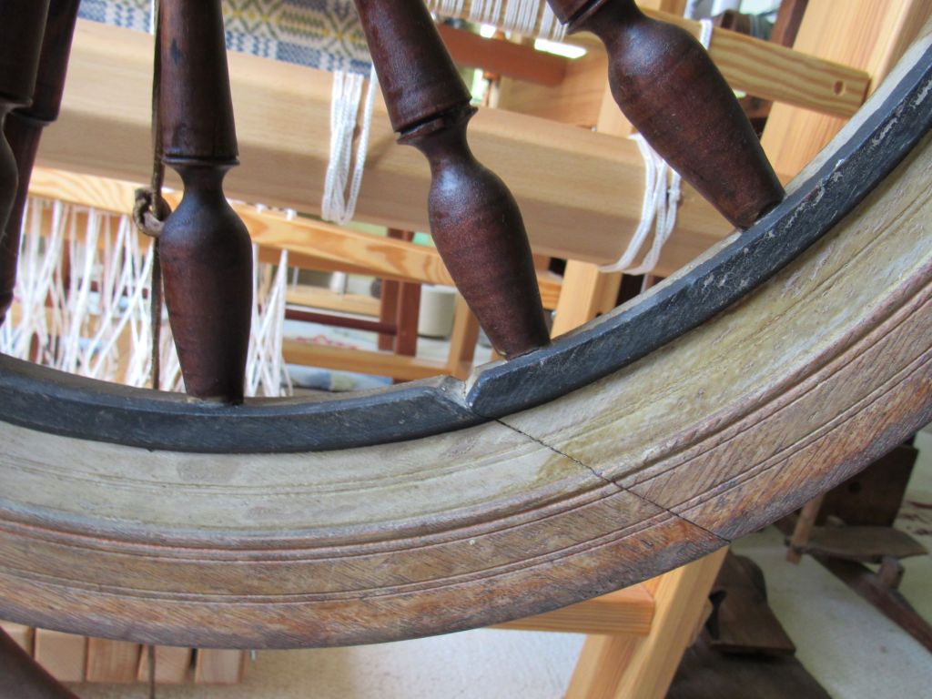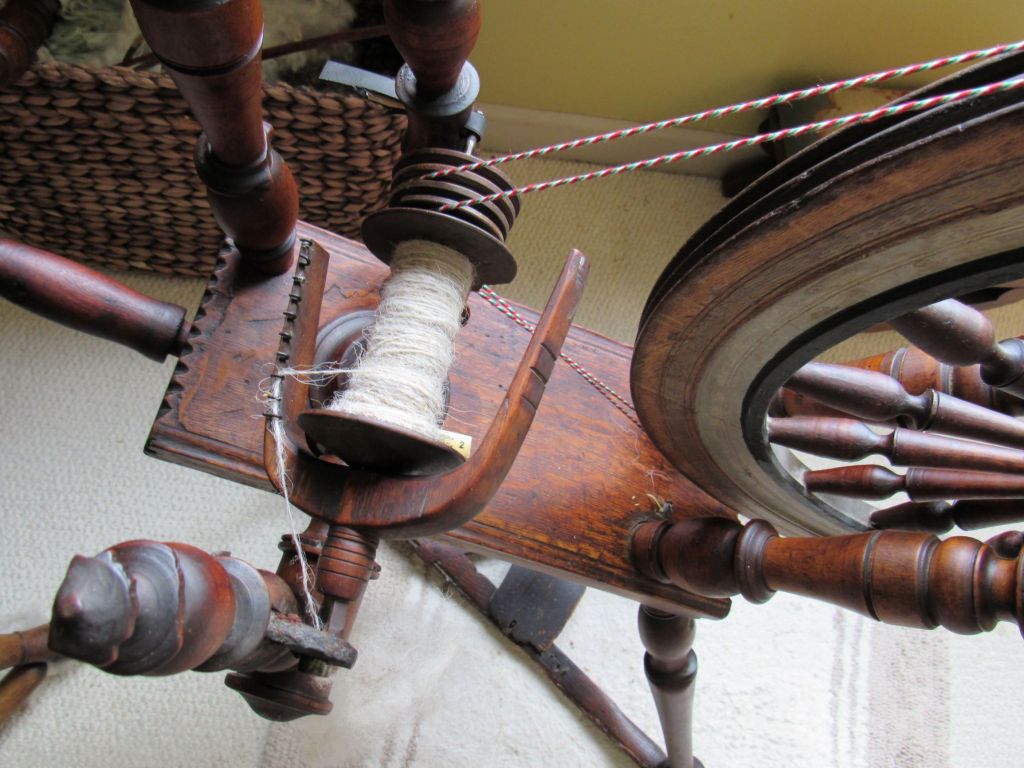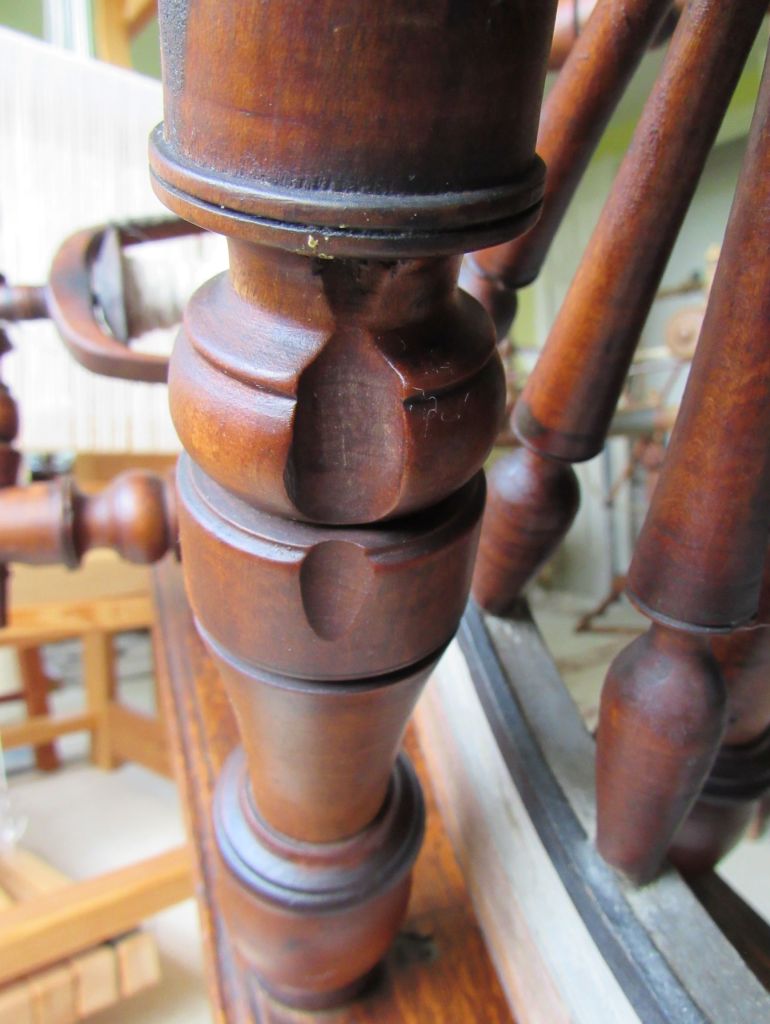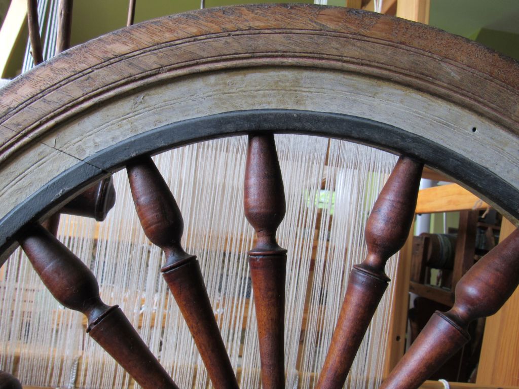 Once I started spinning, I understood that wear. Because the table is so short on this wheel, the spinner’s treadling leg rests naturally on the wheel’s front leg. It’s a comfortable accommodation. But, imagine how much fiber was spun on this wheel and how many decades of women’s legs rested on this wheel’s leg to smooth those grooves into oblivion. It’s a rare privilege to add my leg to their imprint.