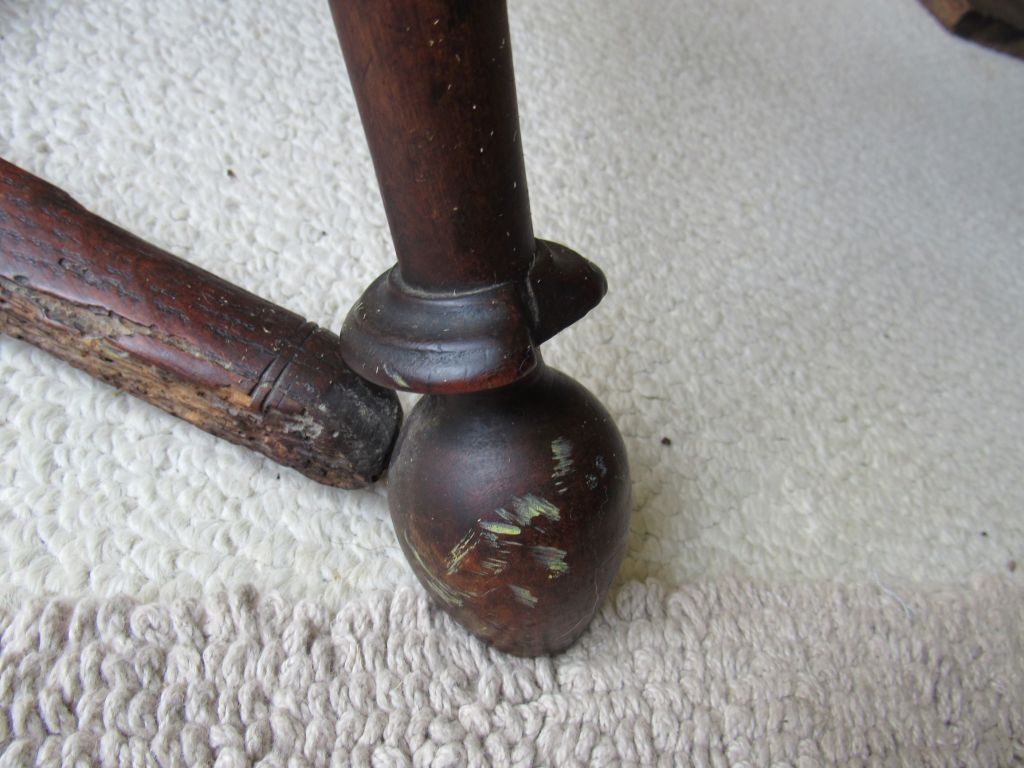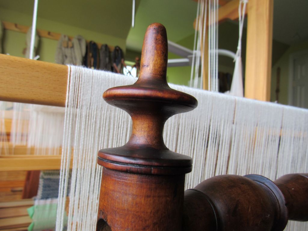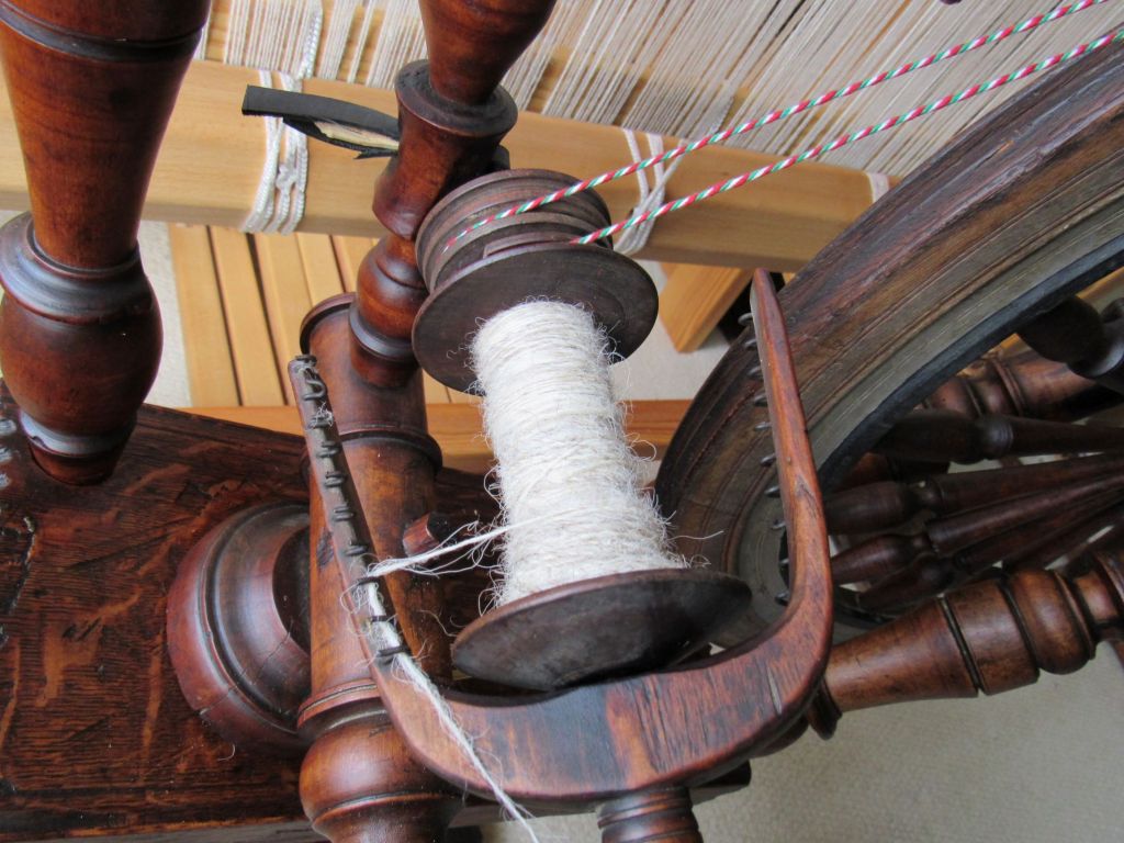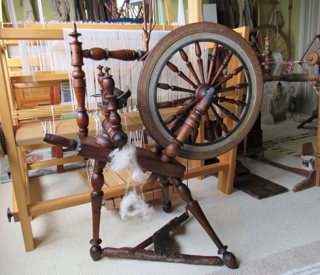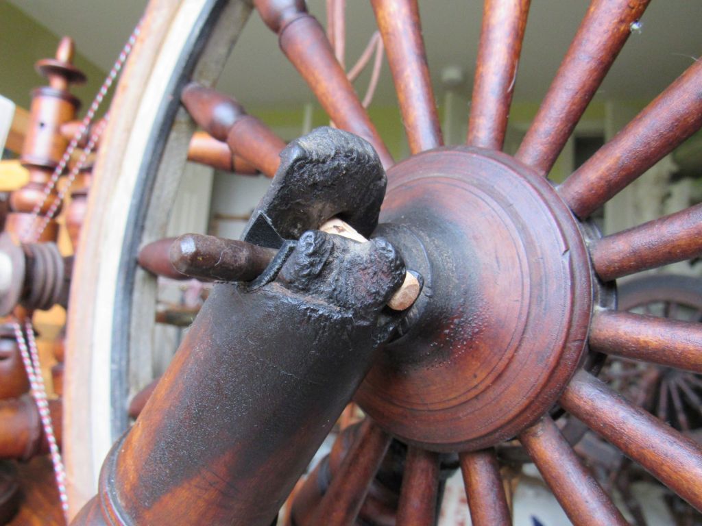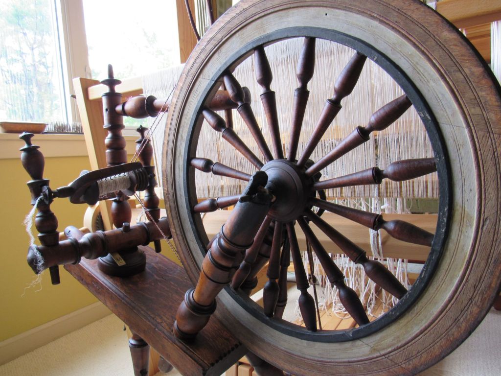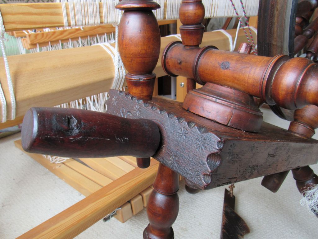 Once I started spinning, I understood that wear. Because the table is so short on this wheel, the spinner’s treadling leg rests naturally on the wheel’s front leg. It’s a comfortable accommodation. But, imagine how much fiber was spun on this wheel and how many decades of women’s legs rested on this wheel’s leg to smooth those grooves into oblivion. It’s a rare privilege to add my leg to their imprint.