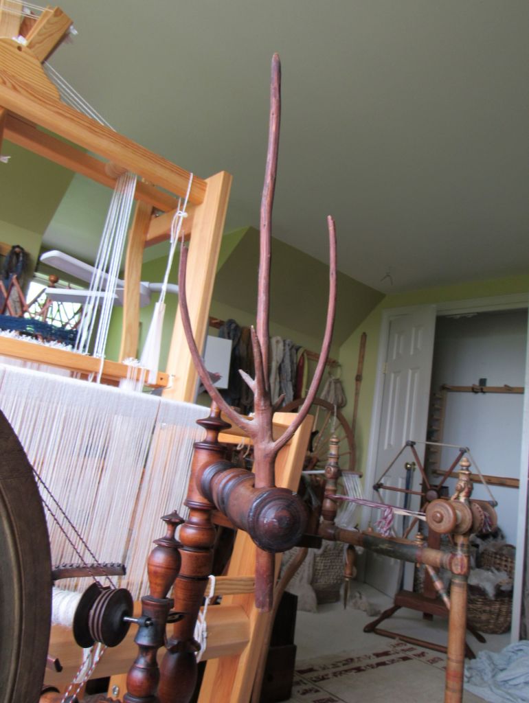 The distaff itself on this wheel is made from a sapling, often used for spinning tow.