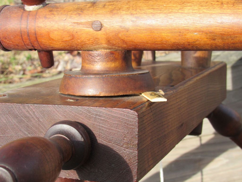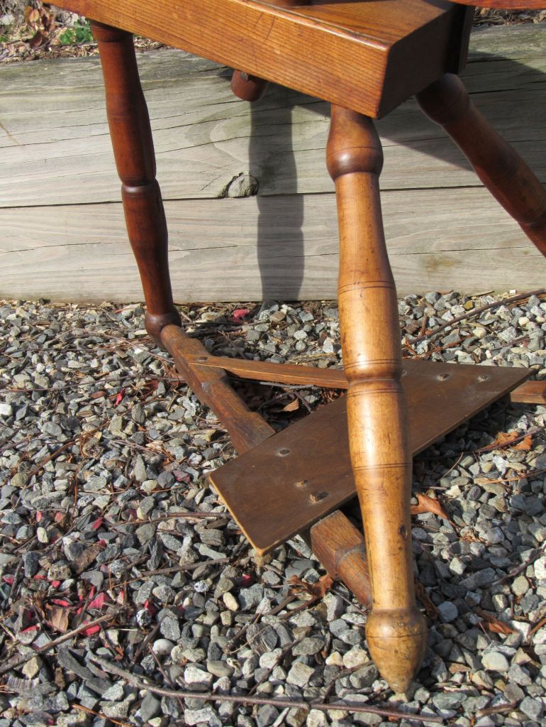 She does not have a maker’s mark but appears to be typically New England.  Her maidens and the upright support suggest a Connecticut influence, while the simple spokes have a Maine Shaker look to them.