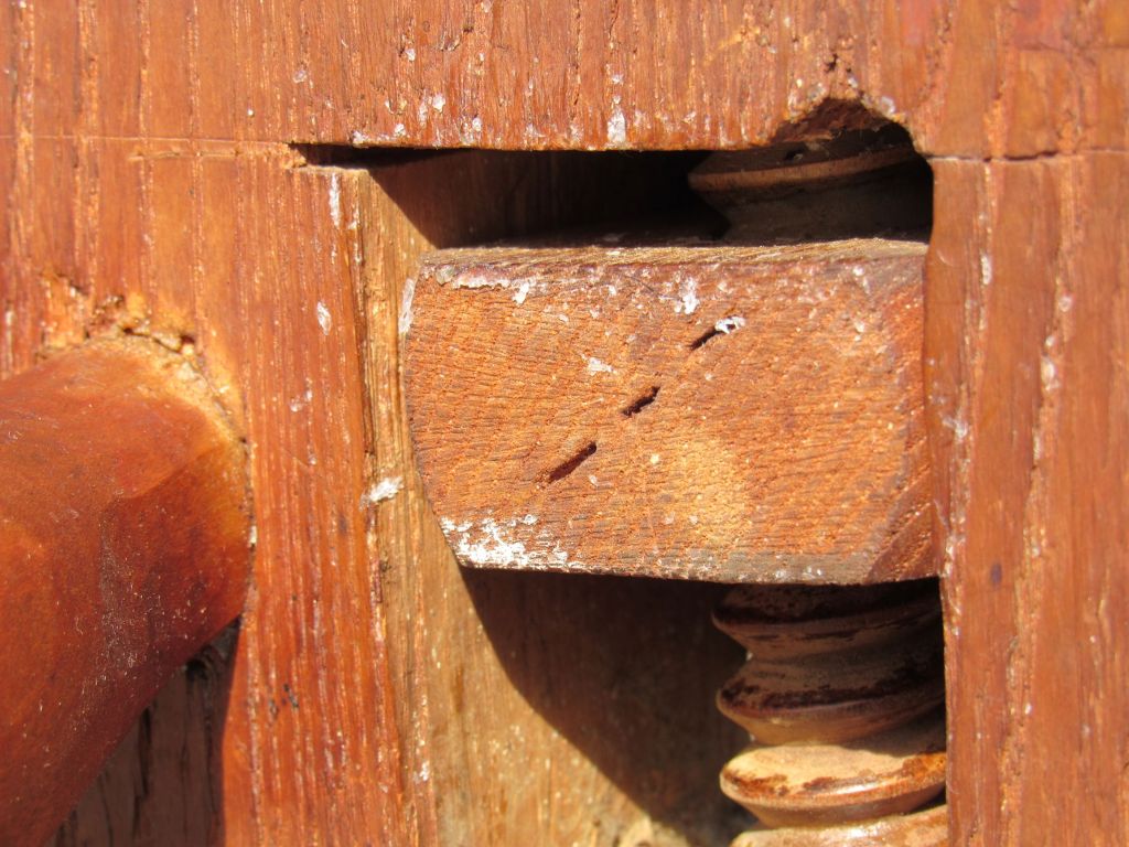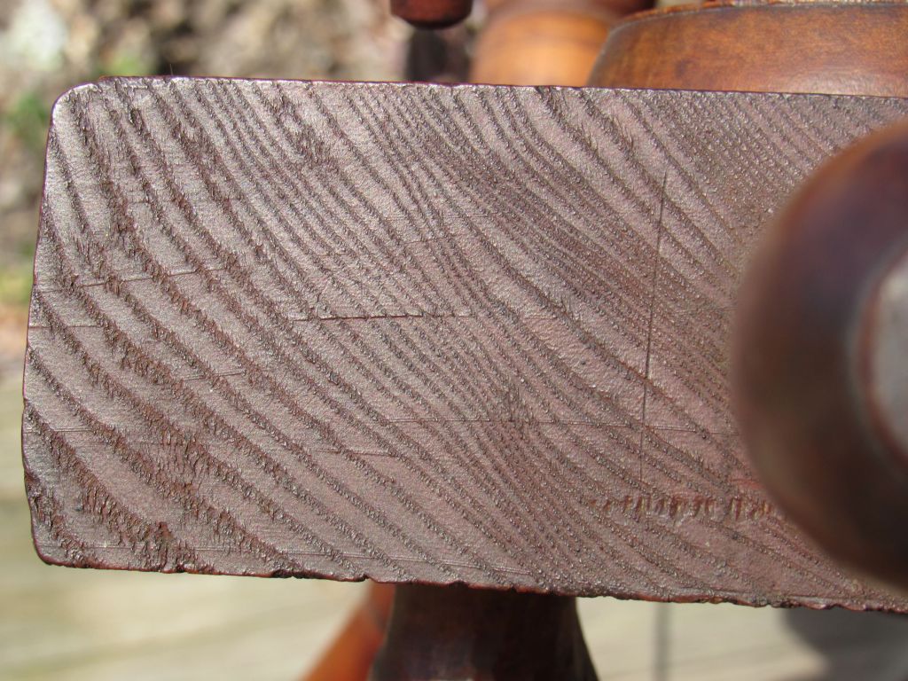 Isn’t that a maker’s mark on the table end very close to the tension screw? It is mis-struck so that the top of each letter is all that can be seen. Try a pencil rubbing to bring up the whole name. I’ll be curious to see the results.