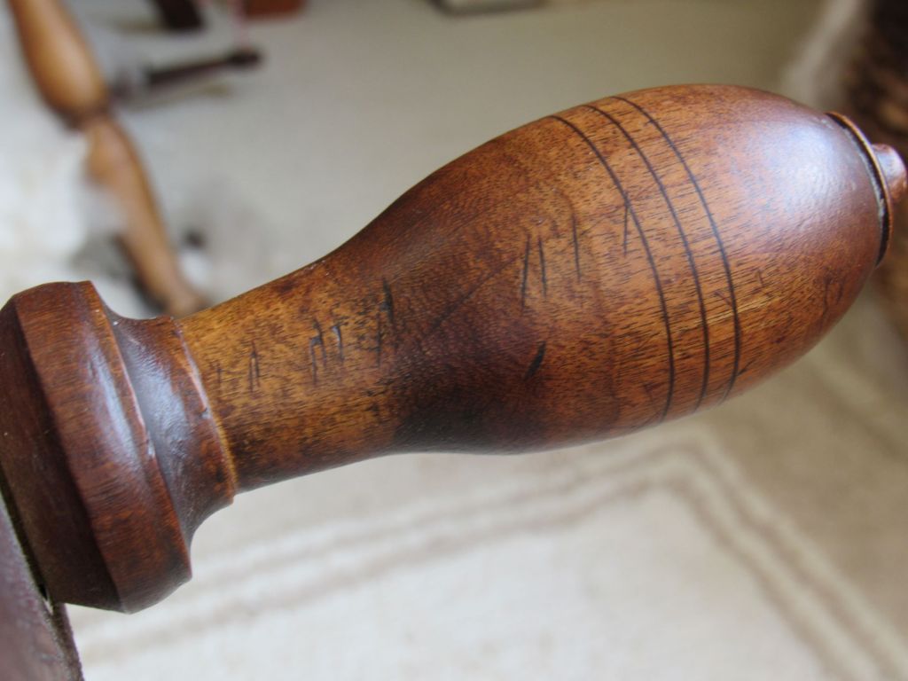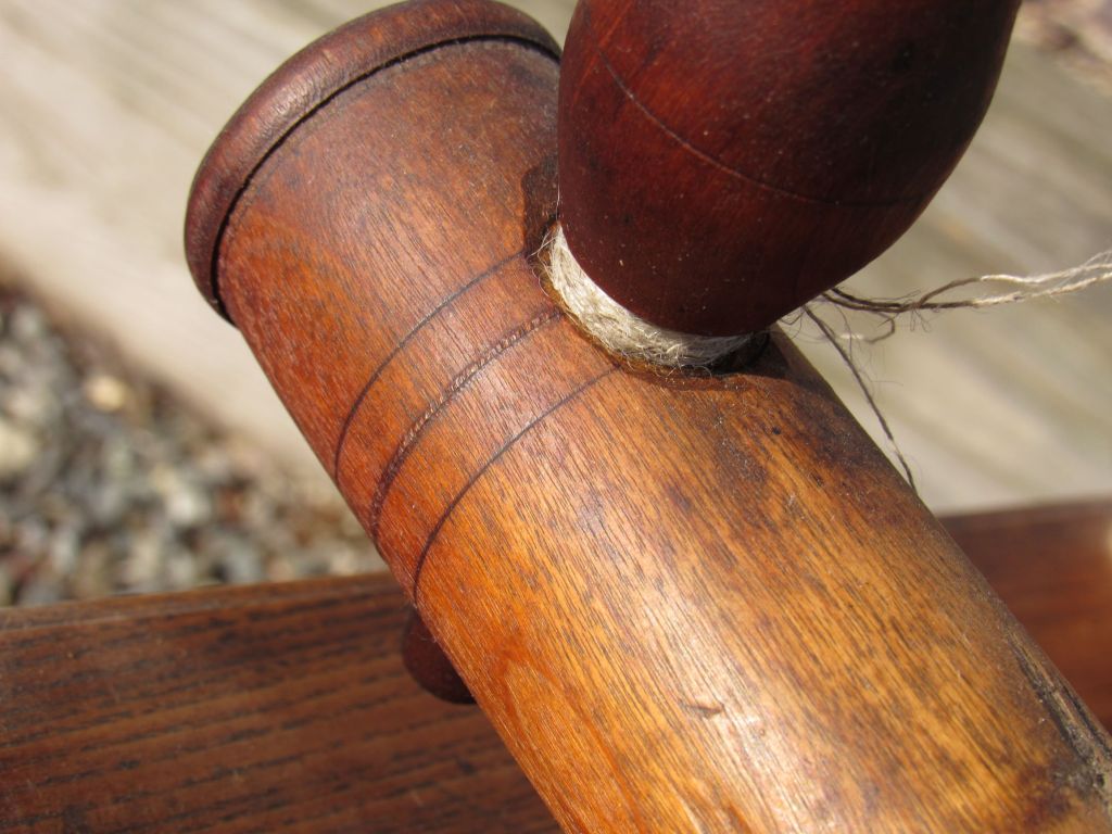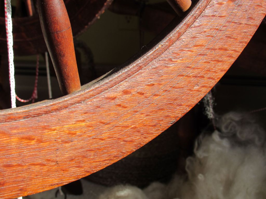 I always like to follow the thread marks on a flyer, to try to interpret how previous spinners worked with the wheel. Was the orifice threaded this way to slow down the uptake, to change the amount of twist, or to accommodate flax vs. wool? Even though it is not that long ago, we are ridiculously ignorant about spinning methods in the 18th and 19th centuries.  At least these old wheels can give us some clues, if we can understand how to read them.