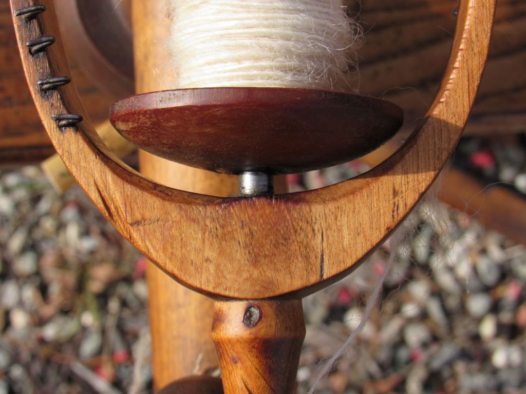 Her bobbin is a little short, giving her a low chatter, unless I wrap a little wool around the mandrel.  And, interestingly, the wear marks on her orifice and flyer arms indicate that the spinner brought the thread around from the underside of the orifice hole.  It still amazes me to see wear marks from thread–likely linen–on metal parts.