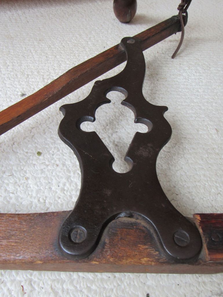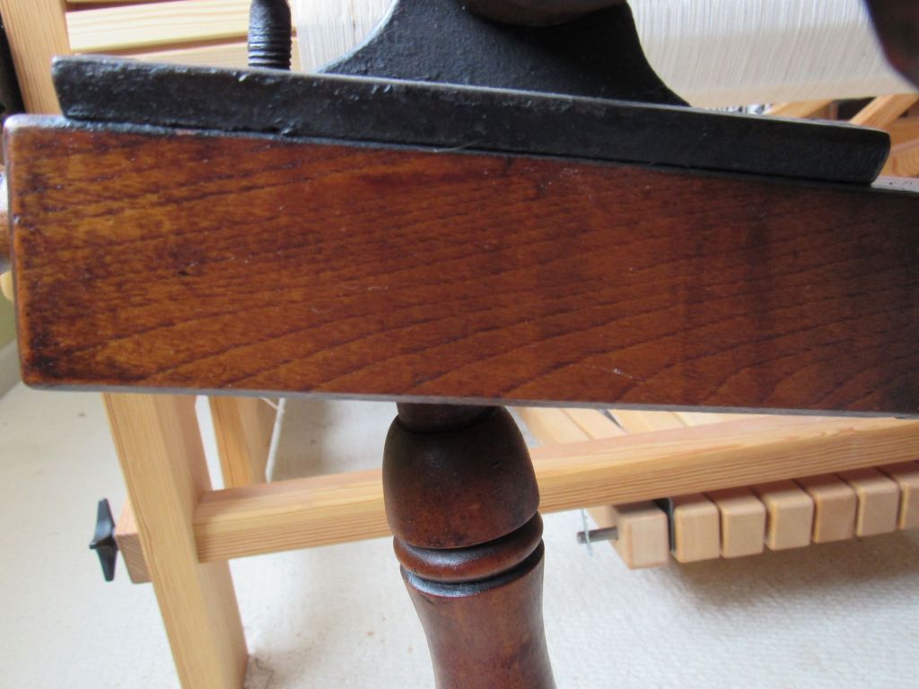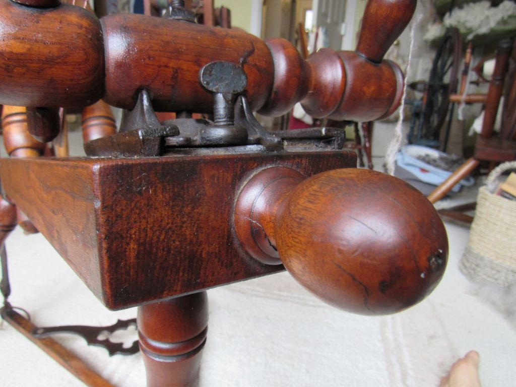 I am a little surprised that this tension style it did not become more popular. Francois Bordua, the creative Quebec wheel maker whose wheels sometimes sported Christmas tree and eagle treadles, also used a slider tension (marked with his initials) on some of his wheels, but slider tensions do not show up very often.