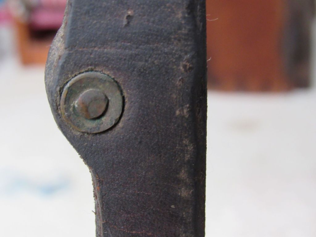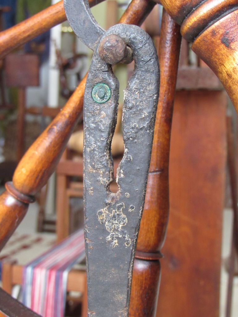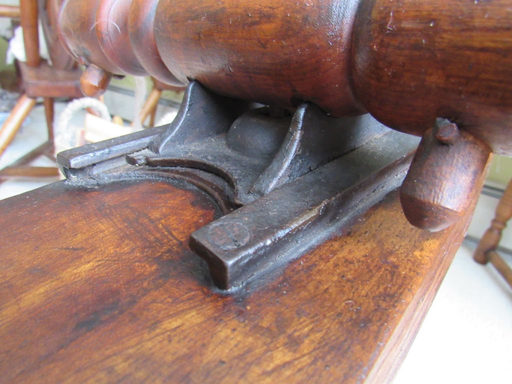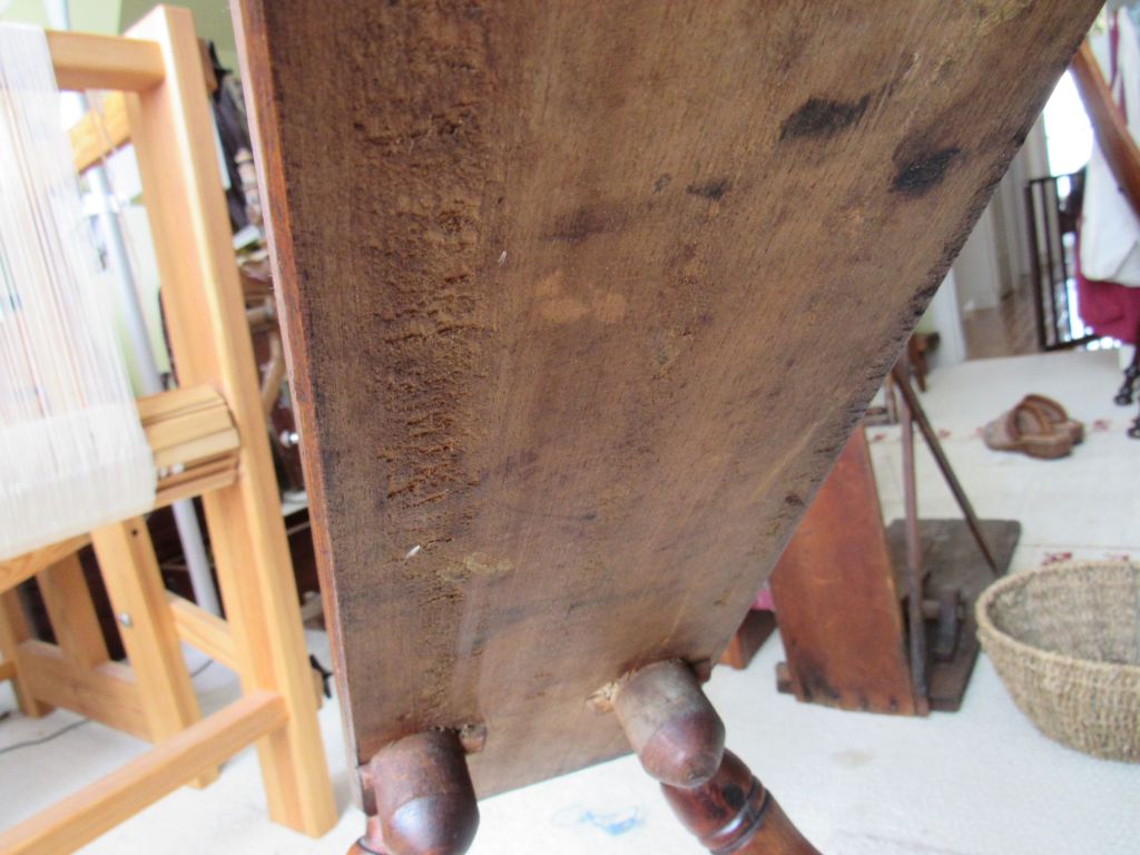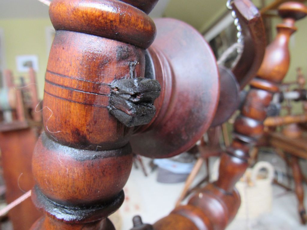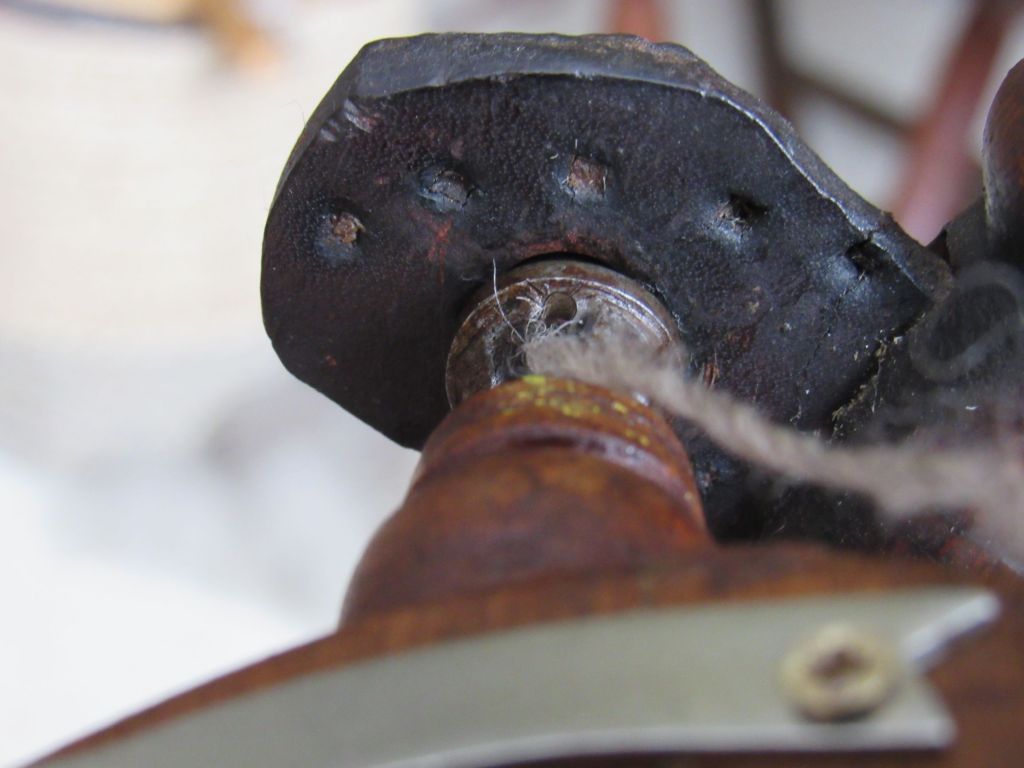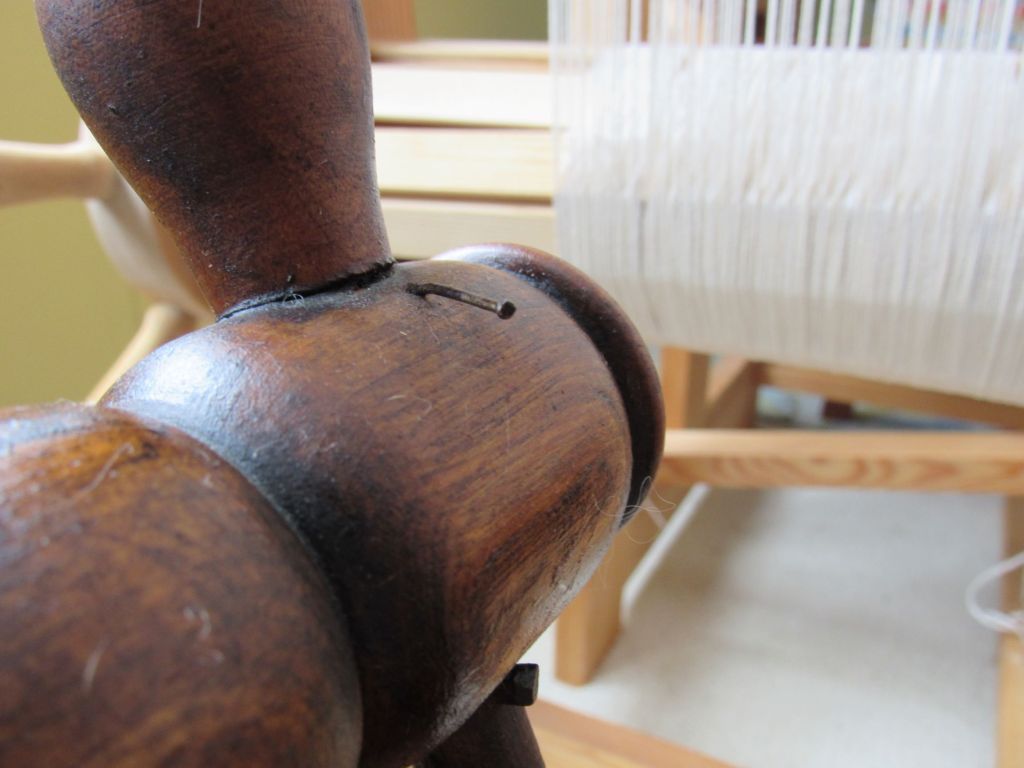 Its purpose is a puzzlement. There also is a nail—what looks like 2 nails, actually, one quite old—in the bottom of the non-spinner side leg, presumably to keep the wheel from sliding across the floor.