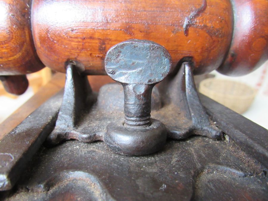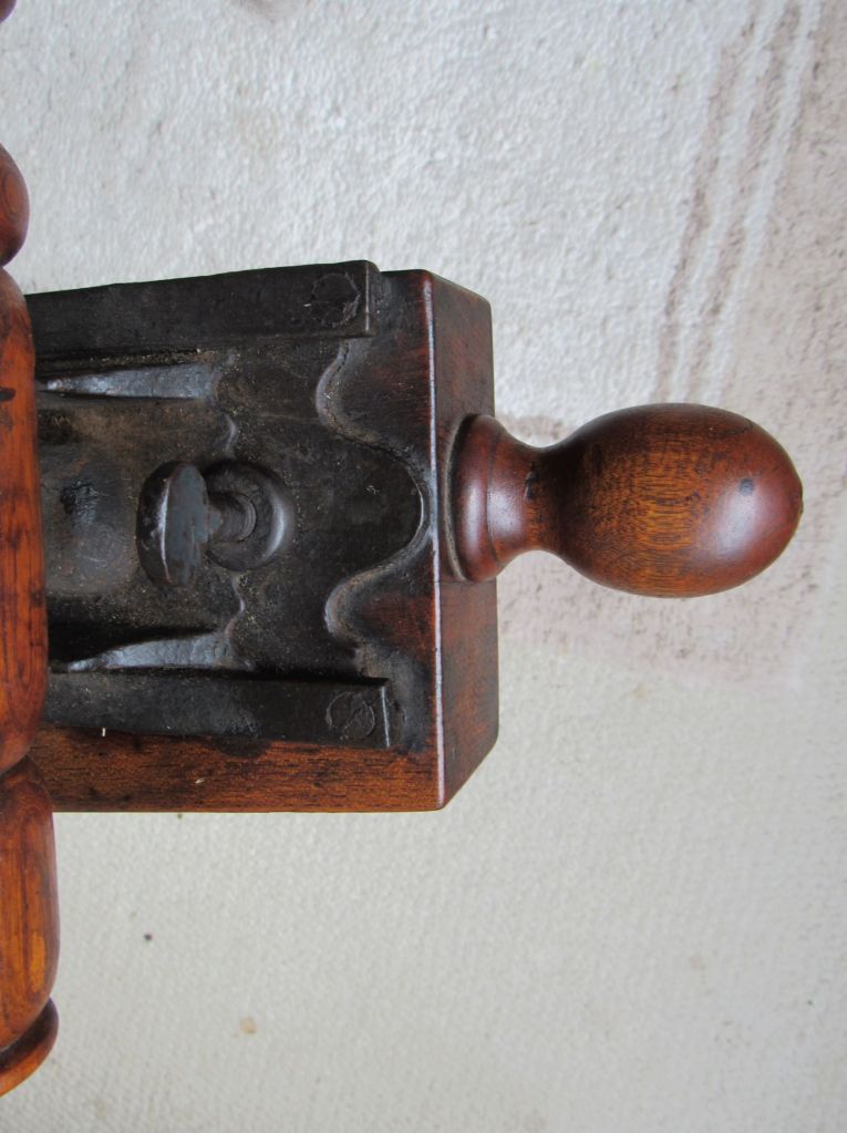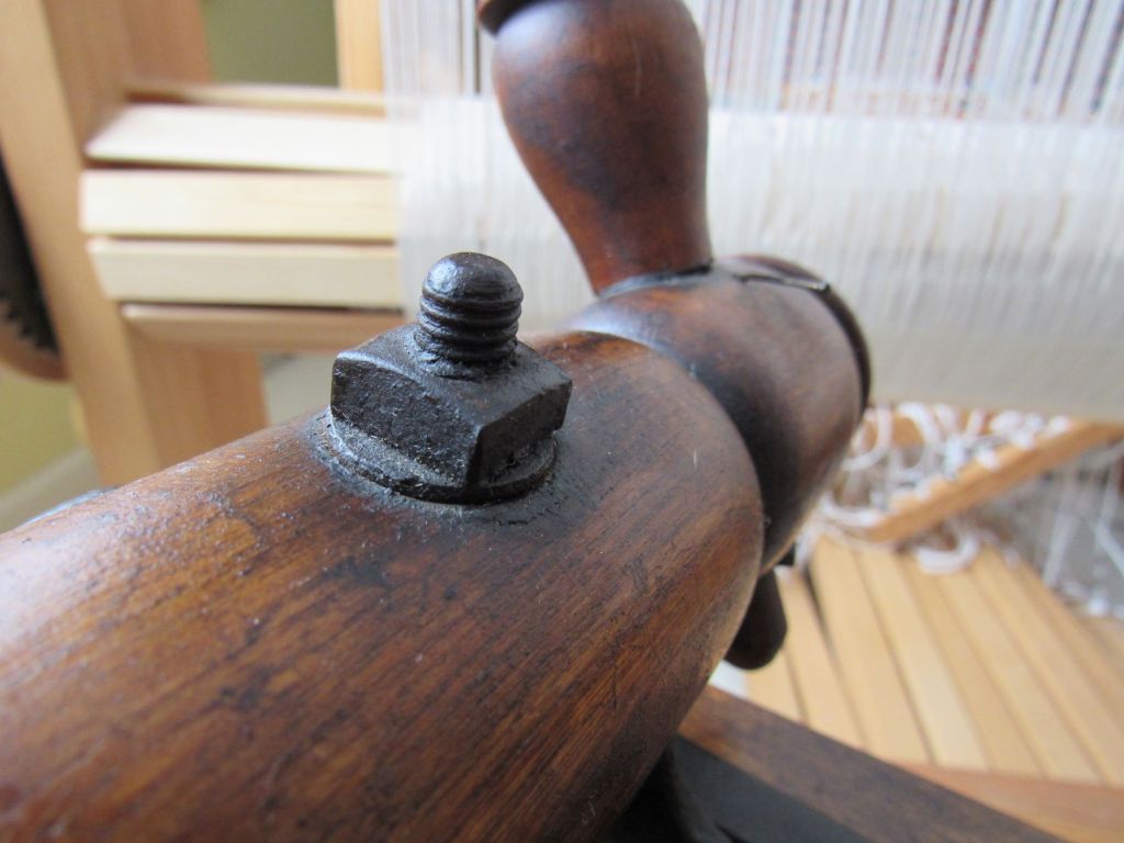 While the slider and tilt tension wheels did away with the need for wooden tension screws, they retained a sort of residual non-functioning screw that serves as a handle to pick up and carry the wheel.