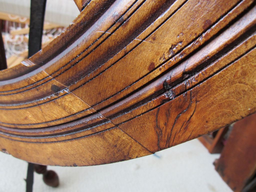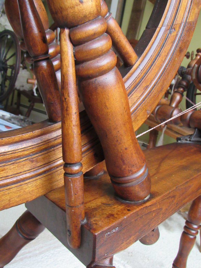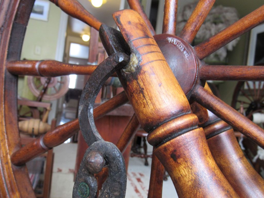 She appears to have been made by Ferdinand Napoleon Vezina (1841-1898) of Vercheres, Quebec, who likely developed this tension system. Faint remnants of his “F.N. Vezina Vercheres” stamp on the wheel’s table can just barely be discerned.