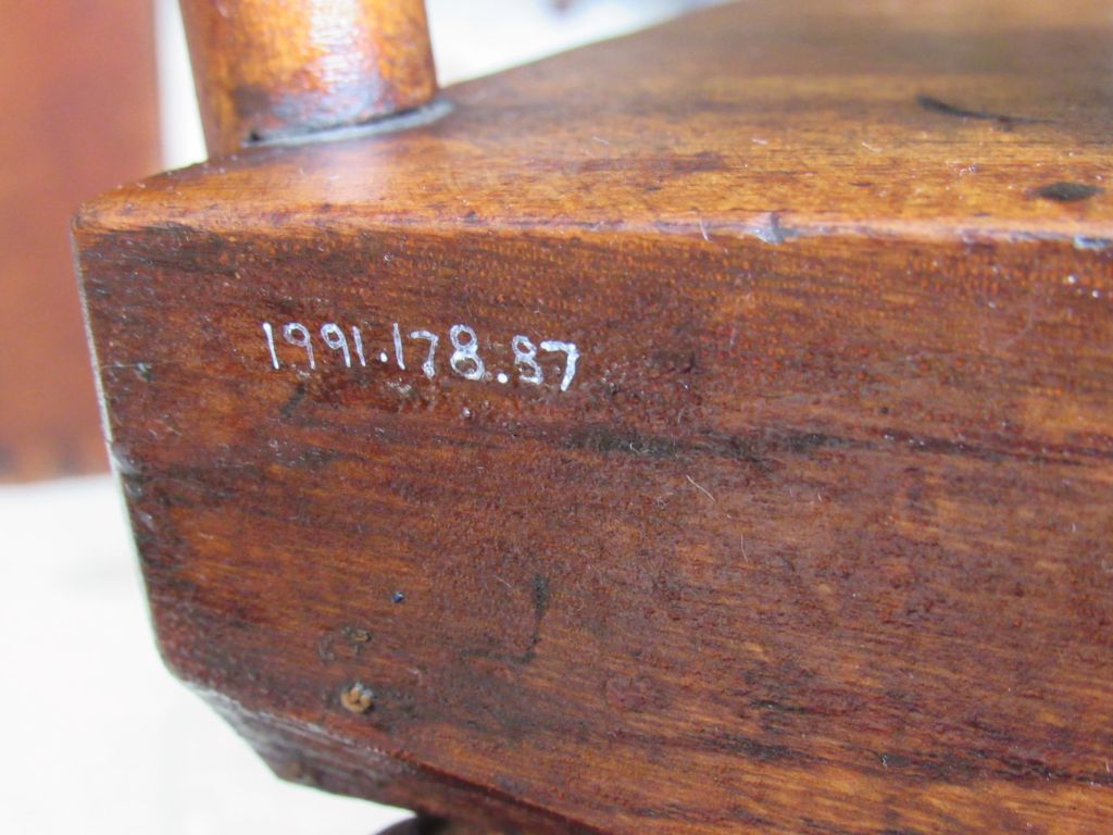 This beautiful wheel was part of Joan Cummer’s collection. It is wheel No. 87 on page 190 of her book, and in its description, she notes that it is slightly smaller than the usual “Great Canadian” wheels—her term for CPWs. Cummer purchased the wheel from an Antrim, New Hampshire antique dealer and later donated it, along with the rest of her collection to the American Textile History Museum.