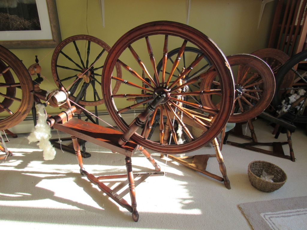 By the time they get to us, many Quebec wheels have replacement flyers or drive wheels. Even when parts were from different makers, there seems to be a happy interchangeability. Zotique is an interesting mix, with some unusual features. A Quebec wheel, with a drive wheel diameter of about 30 inches and a tilt tension system, it falls within the definition of a Canadian Production Wheel (CPW).