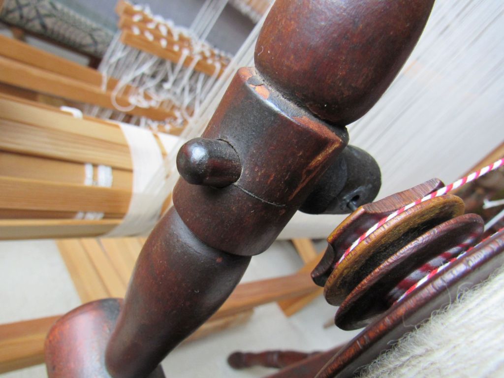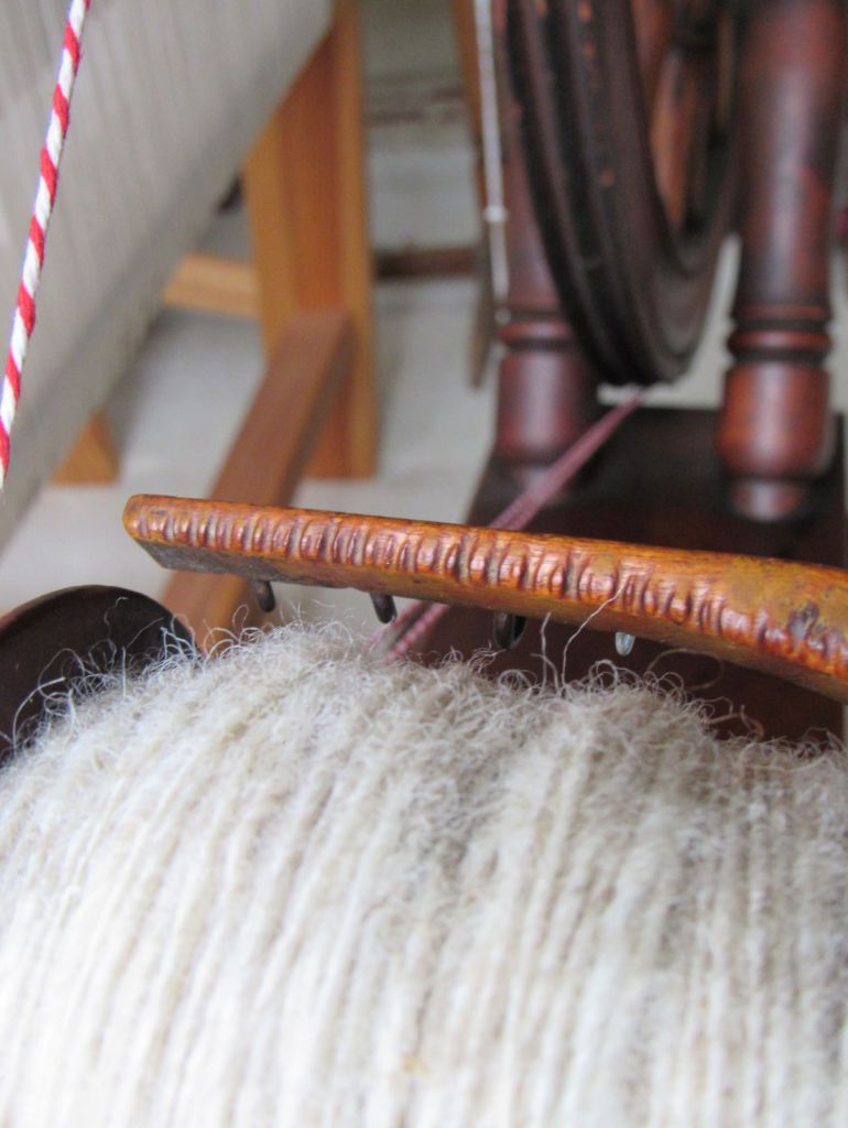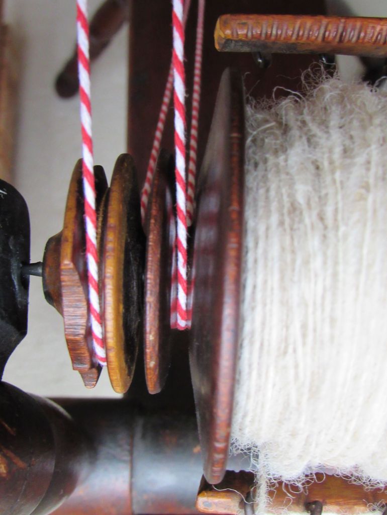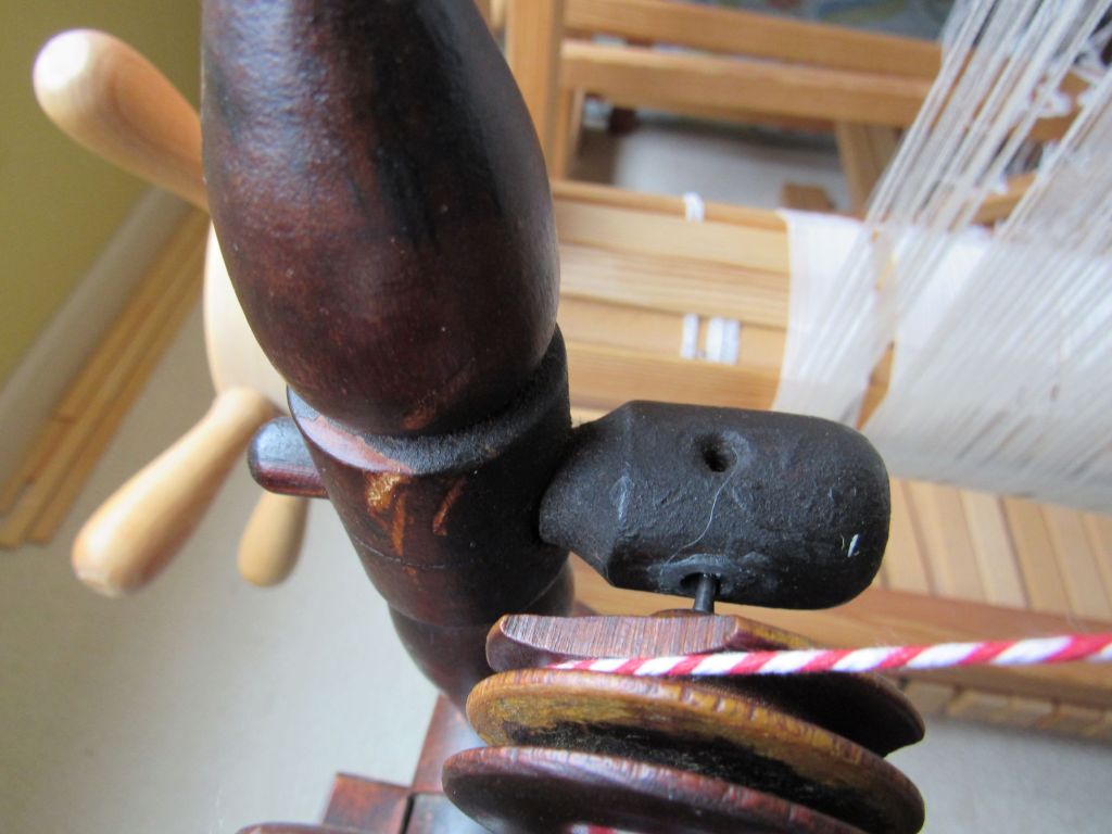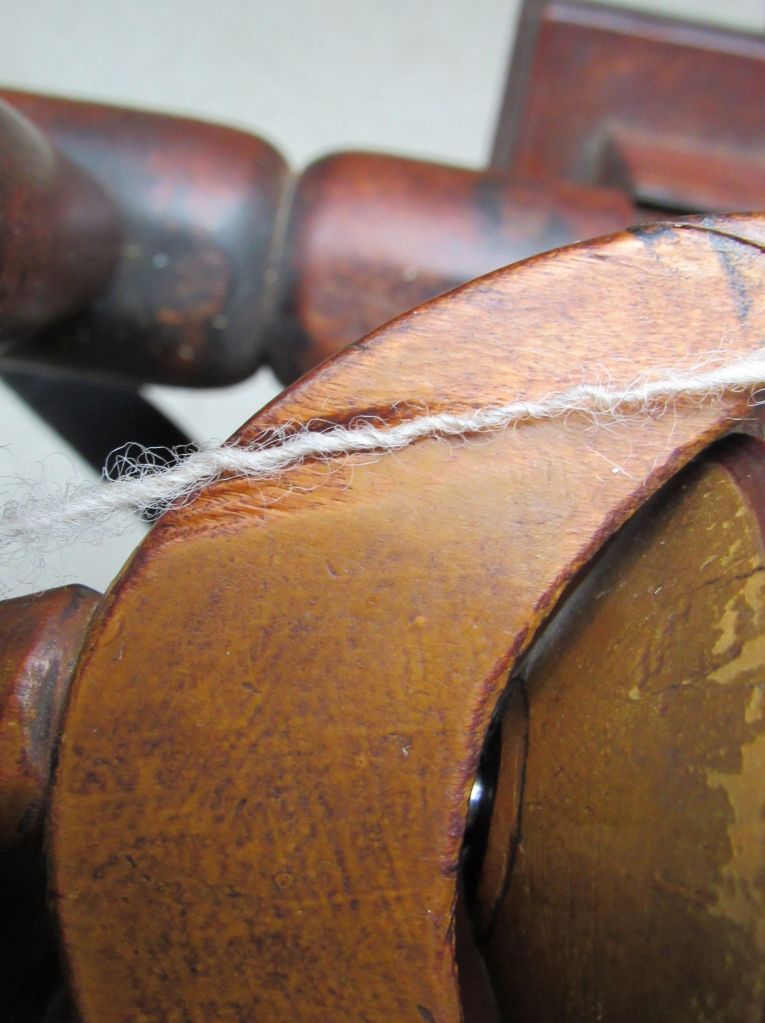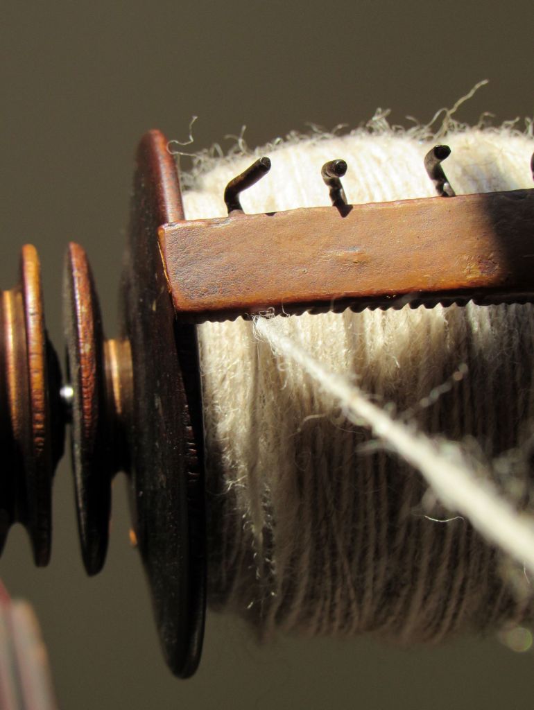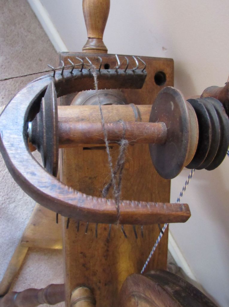 You see them a lot on New England and Nova Scotia wheels, but less often on Quebec wheels. The origin of these grooves is a source of debate. The two most prevalent theories are that they are the result of cross-lacing or winding off. In cross-lacing, yarn is passed from hooks on one side of the flyer to the other, which helps control the speed of the uptake, allows for more uniformity of finely spun yarn, and—with linen—helps to even out the ridges that are formed on the bobbin as the thread piles up at the point of each hook.