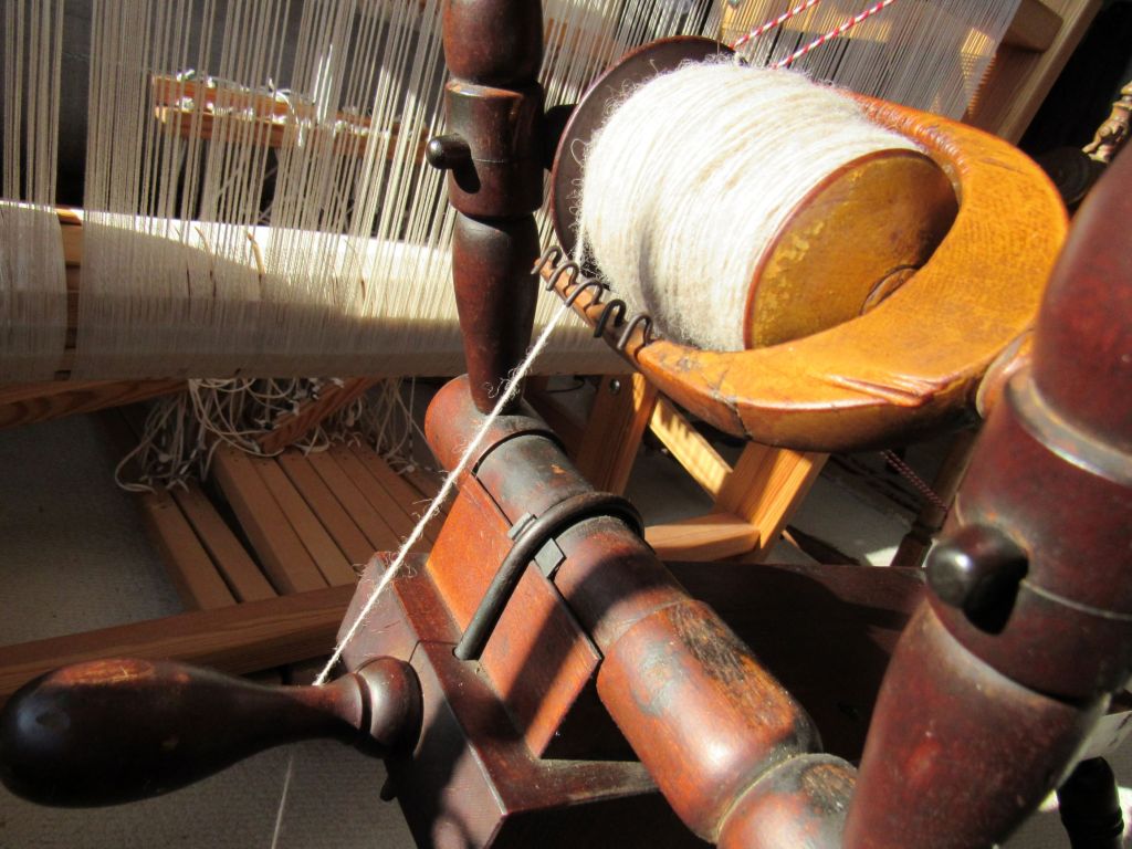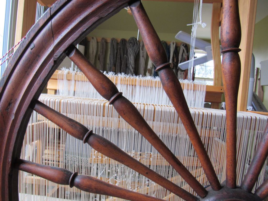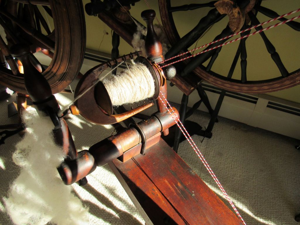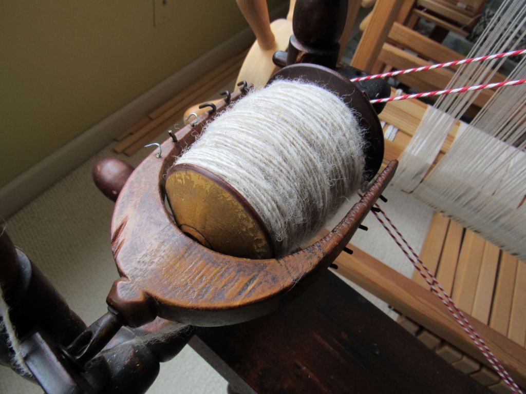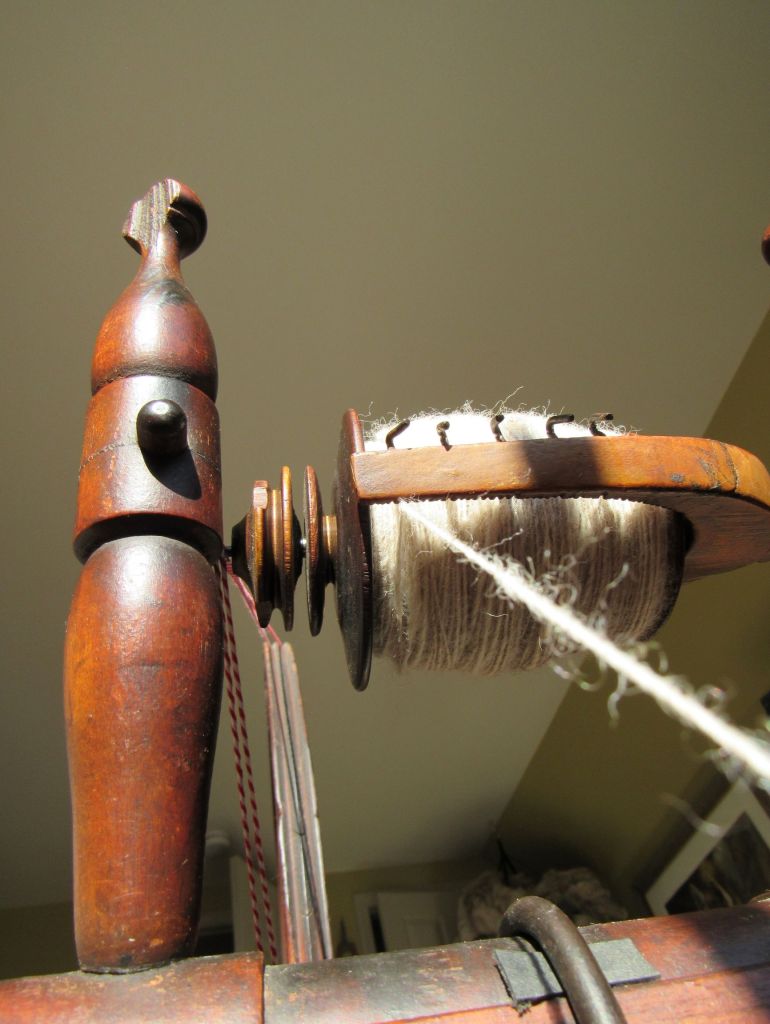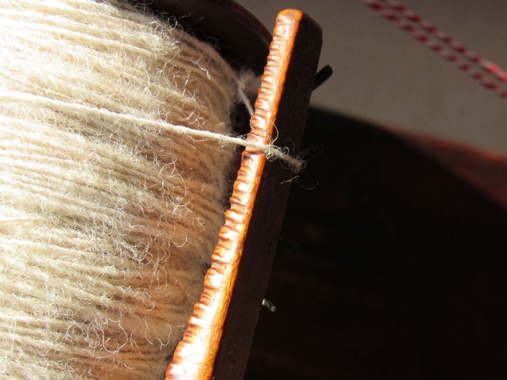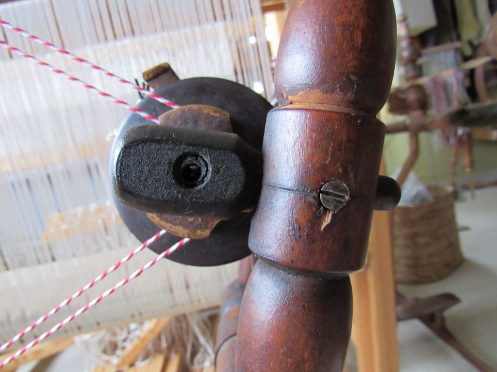 You see them a lot on New England and Nova Scotia wheels, but less often on Quebec wheels. The origin of these grooves is a source of debate. The two most prevalent theories are that they are the result of cross-lacing or winding off. In cross-lacing, yarn is passed from hooks on one side of the flyer to the other, which helps control the speed of the uptake, allows for more uniformity of finely spun yarn, and—with linen—helps to even out the ridges that are formed on the bobbin as the thread piles up at the point of each hook.