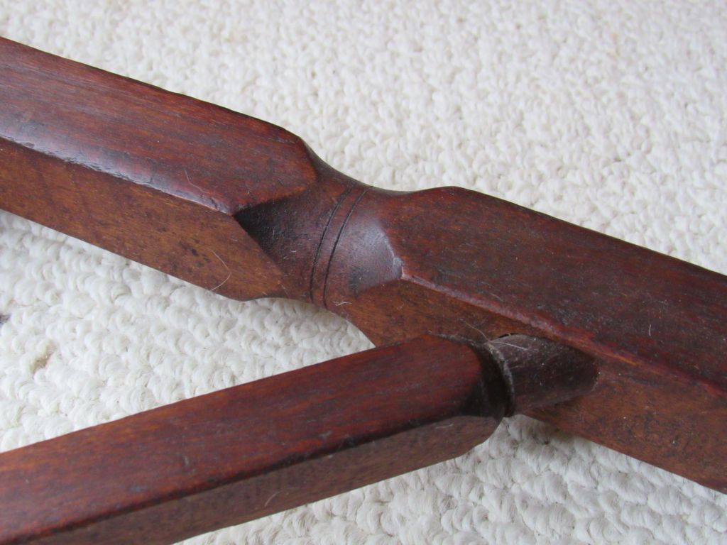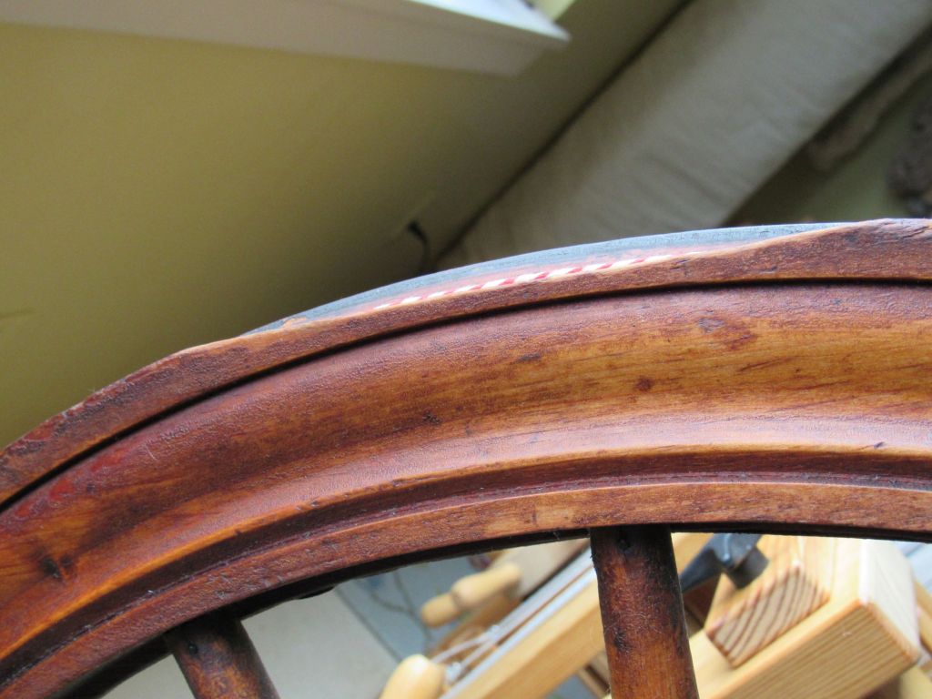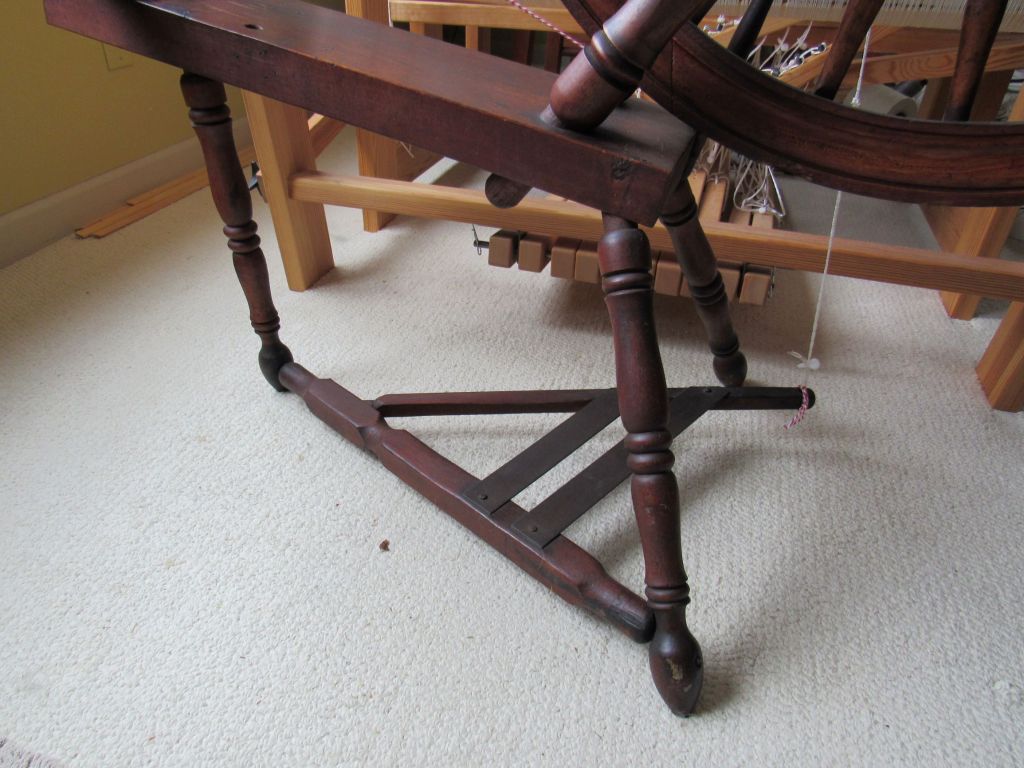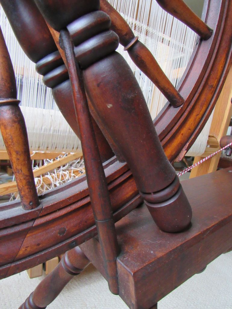 Still, it is interesting that when Quebec wheels evolved to tilt tension, the tension knobs remained, perhaps not only as a handle for carrying, but as a tool for winding off. I have several Nova Scotia wheels where heavy flyer arm grooves are matched by heavy grooves in the tension knob. This wheel does not have grooves on the tension knob, but I would love to see if there are grooves in the tension knob on this flyer’s original wheel.
