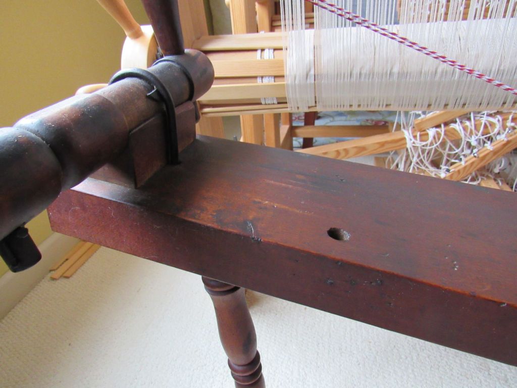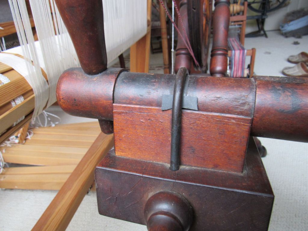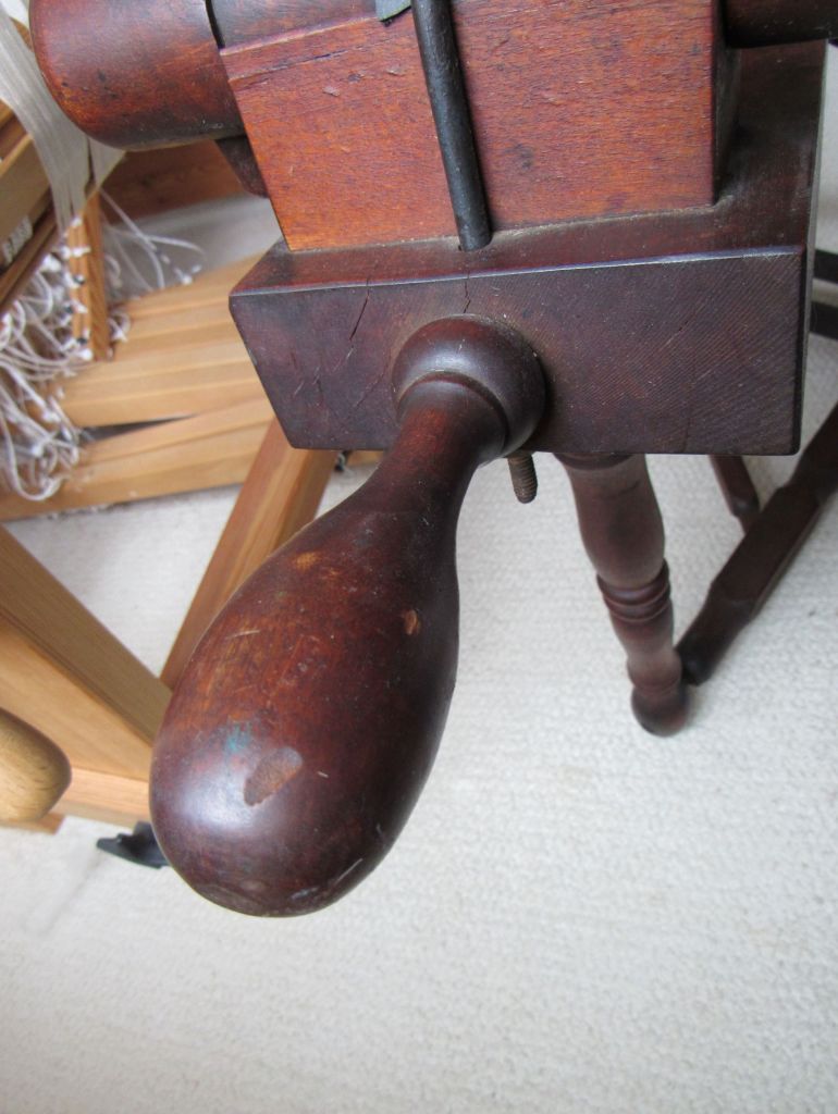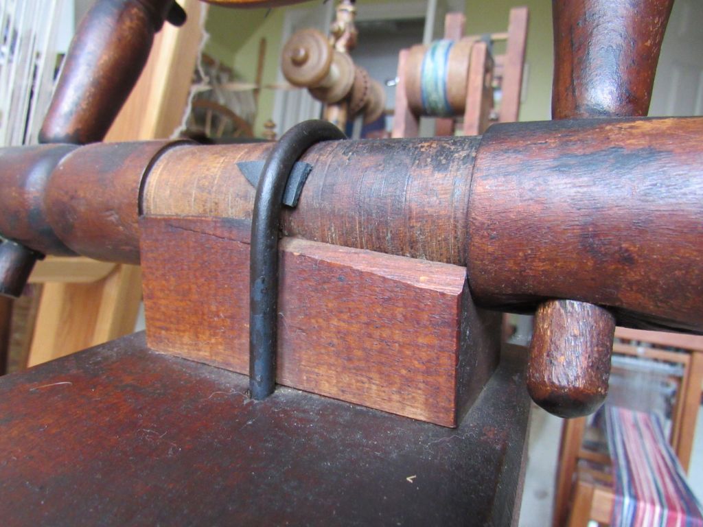 These holes are found on some Quebec wheels, but most do not have them. The obvious use for the hole would be for mounting a distaff or a water dish for spinning flax. Although flax was grown and spun in Quebec, it was not widespread, especially by the time that this wheel was manufactured in the early 1900s (Antoine Emile patented this wheel style in 1899). In fact, these wheels were designed and singularly suited for spinning wool, fine and fast–not flax. Moreover, I am not aware of any photographs showing flax spinning or distaffs on a tilt tension Quebec wheel. So, the hole remains a bit puzzling.