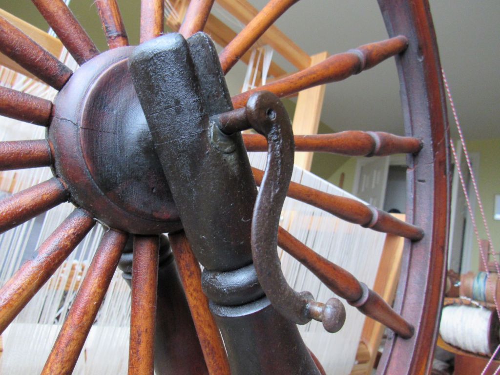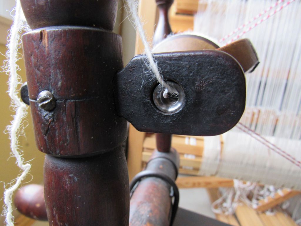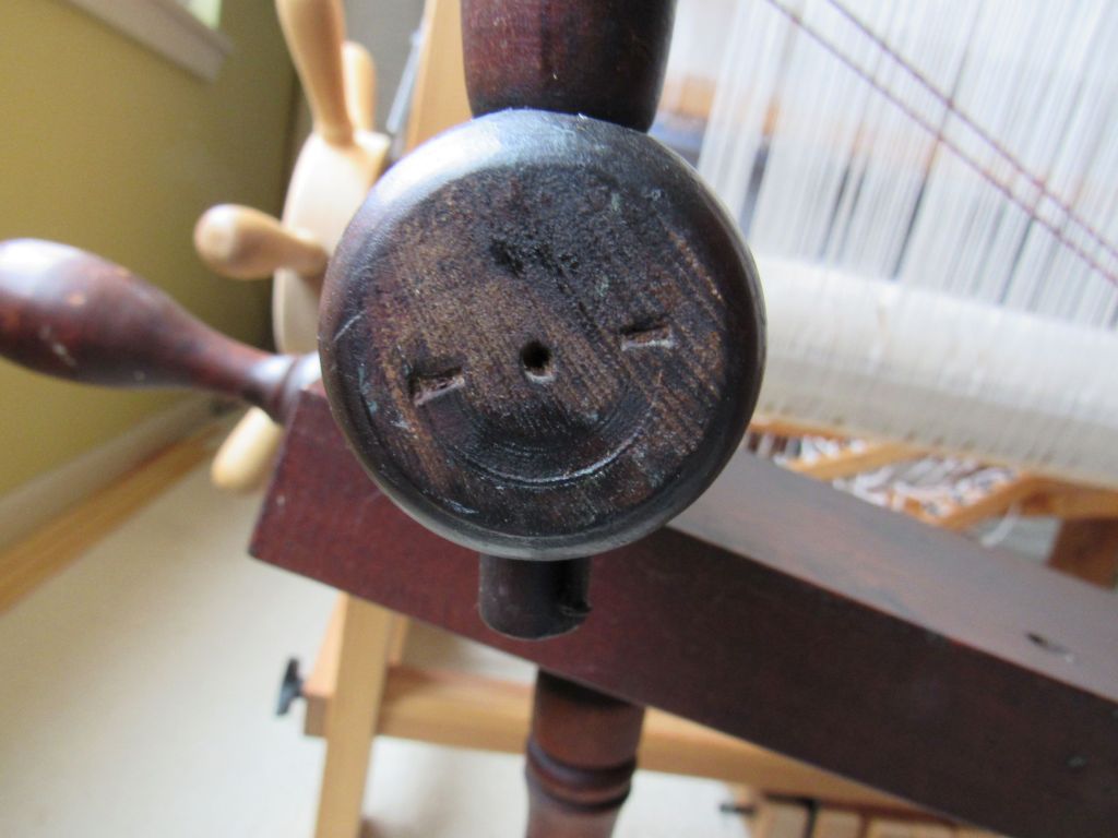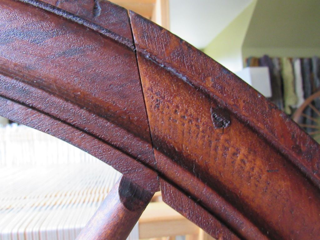 These holes are found on some Quebec wheels, but most do not have them. The obvious use for the hole would be for mounting a distaff or a water dish for spinning flax. Although flax was grown and spun in Quebec, it was not widespread, especially by the time that this wheel was manufactured in the early 1900s (Antoine Emile patented this wheel style in 1899). In fact, these wheels were designed and singularly suited for spinning wool, fine and fast–not flax. Moreover, I am not aware of any photographs showing flax spinning or distaffs on a tilt tension Quebec wheel. So, the hole remains a bit puzzling.