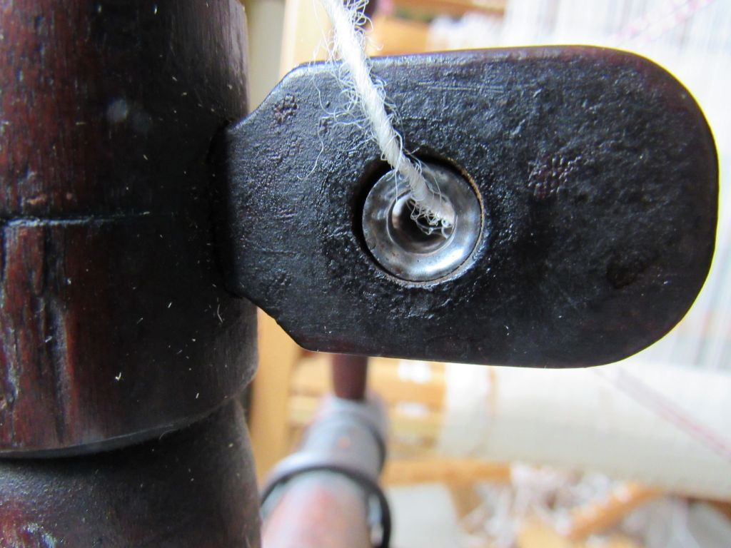 The thread usually rubs against the inside of the flyer arm at a pretty good rate of speed, moving along the length of the bobbin as it winds off.