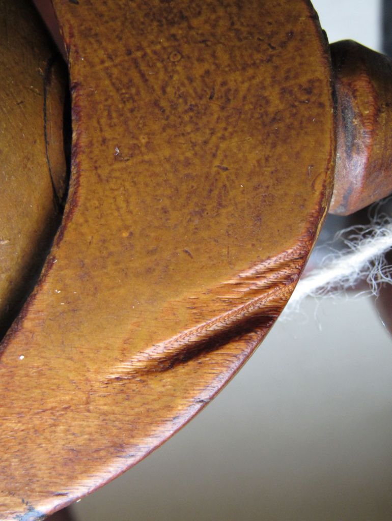 On the other hand, the grooves are on the edge that would have been impacted by winding off. Most antique wheels did not have multiple bobbins and thread was wound off onto a reel when the bobbin was full. In winding off, many spinners ran the thread around the tension screw handle on the way to the reel. With most wheels, an arm comes to rest against the thread as it heads to the tension screw.