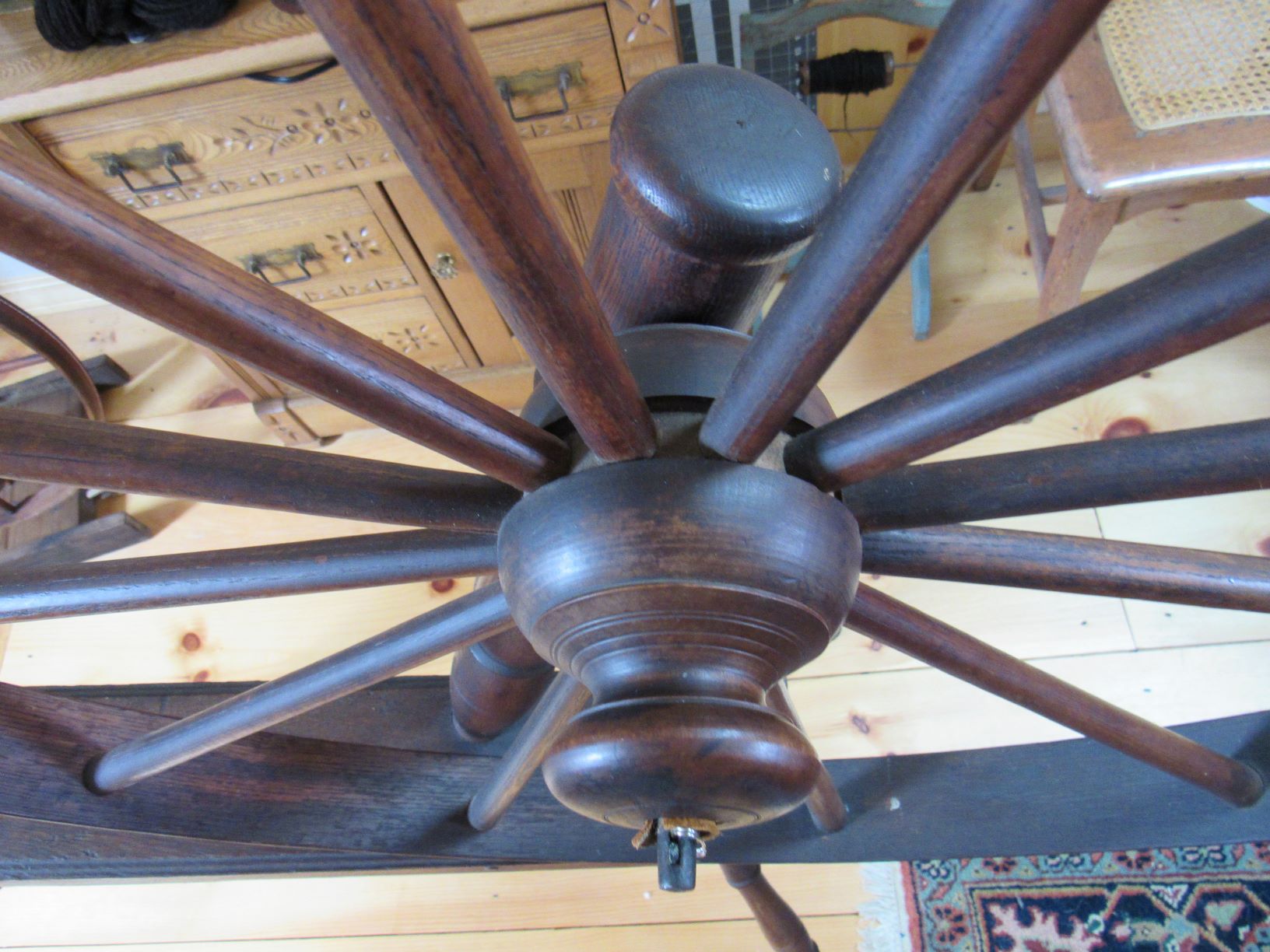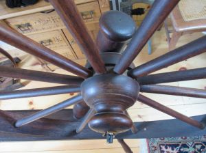 Antique spinning wheels, looms, and fiber tools