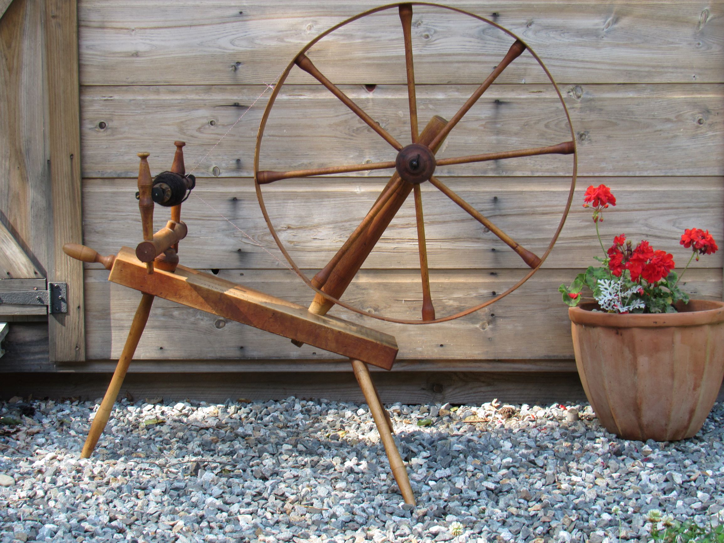 Antique spinning wheels, looms, and fiber tools