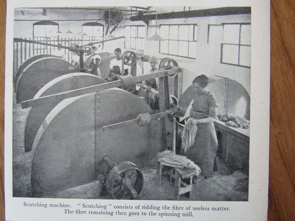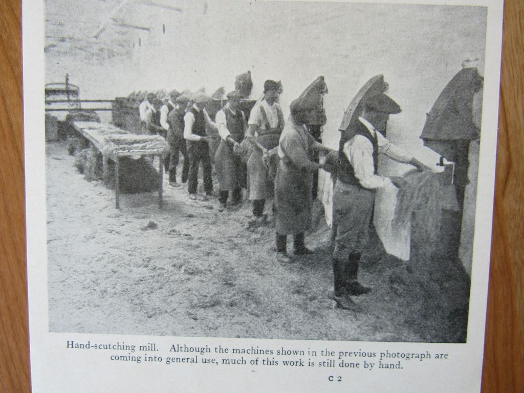 Eventually scutching machines were mechanized and in Ireland, scutching mills were commonly used by the mid 19th century. They were efficient and dangerous, with fast whirring blades always a threat to cut off fingers and hands, or even entangle long hair.
