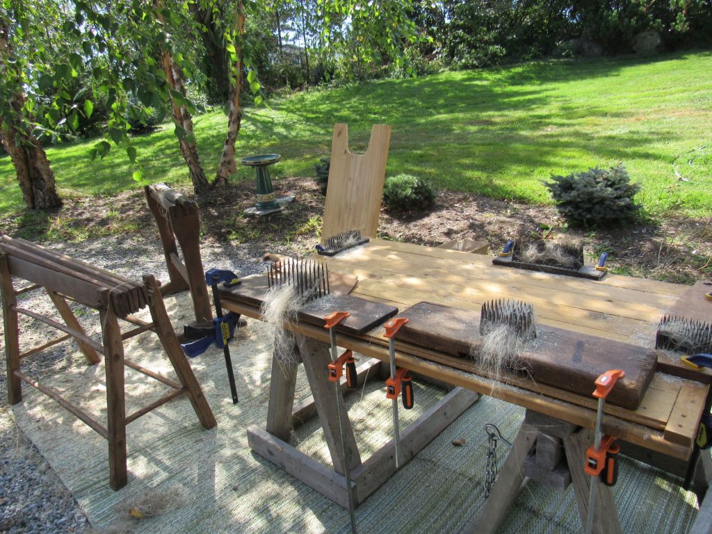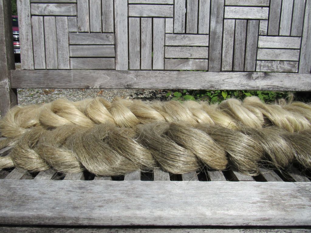 —a process called rippling–and the stalks are retted, so that the fiber can be separated from the woody boon or shive—usually with a flax break. For detailed explanations and photographs of these initial steps, see my previous post “A Ripple and Breaks.”